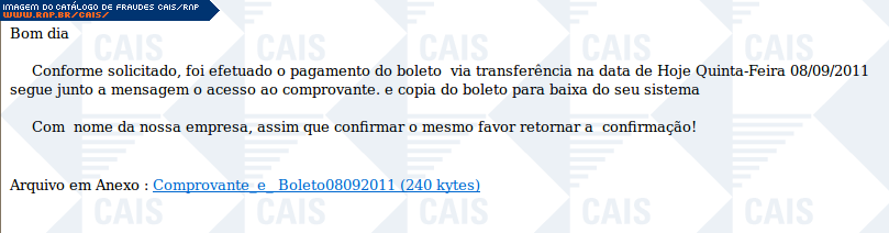 | comentário | A mensagem se passa pelo envio de um comprovante de transferẽncia. O link para o suposto comprovante leva a um arquivo malicioso que foi identificado como Trojan.Crypt.Delf.AG (BitDefender). | |