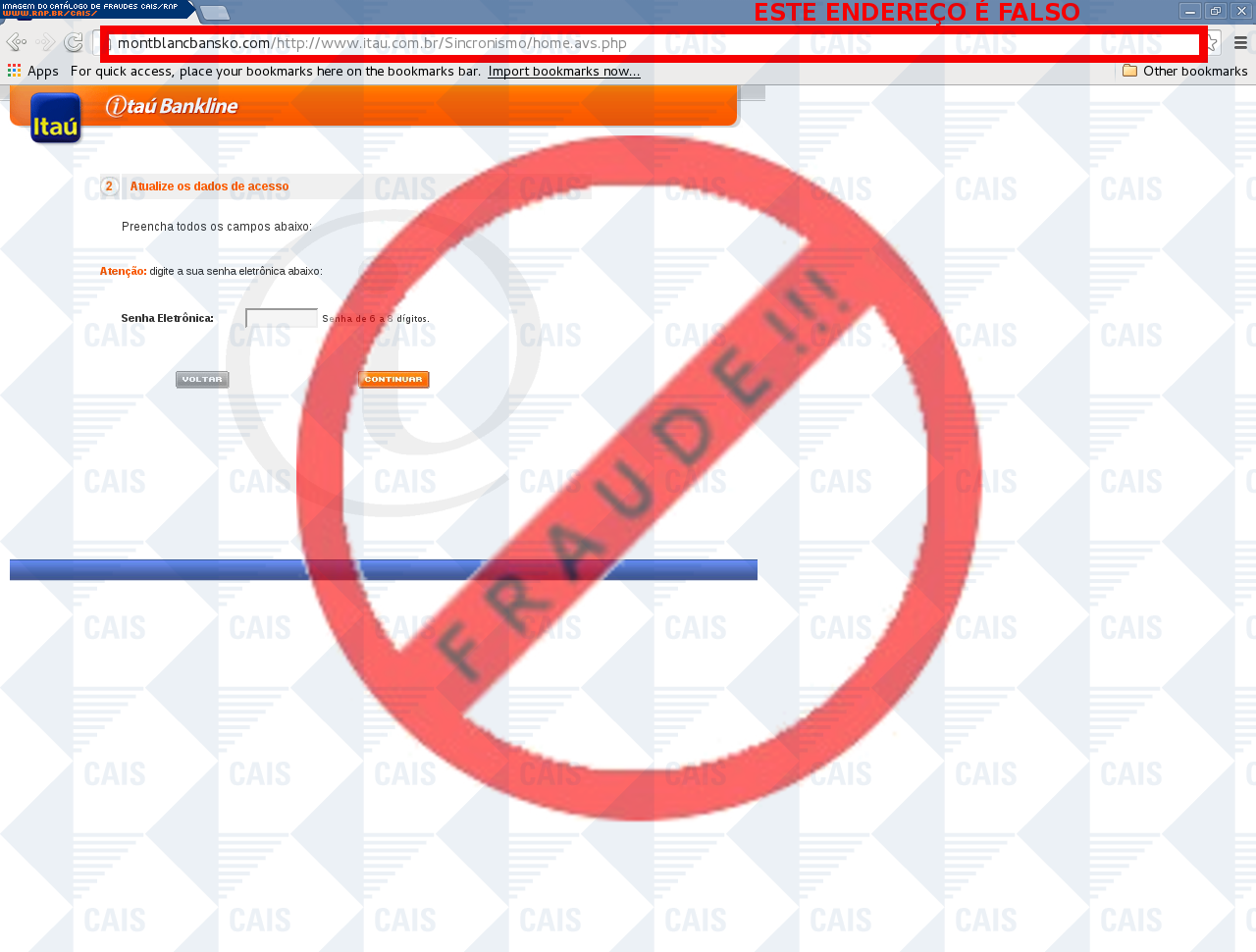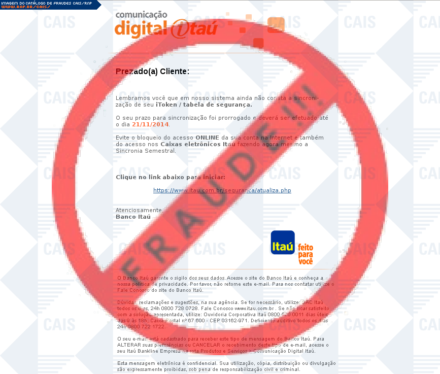 Esta página tem função informativa e educativa. Exibe uma coleção de imagens de phishing scam (fraudes eletrônicas) ou malware (código malicioso) veiculados por meio de spam (e-mail não-solicitado). Trata-se de conteúdo exemplificativo, não exaustivo, uma vez que não é possível contemplar todos os casos de fraudes existentes. Assim, caso você tenha conhecimento de um exemplar que não esteja aqui presente, isto não significa que não seja válido ou real. Inclusive incentivamos que você o envie para análise do CAIS para que, se for o caso, passe a integrar o nosso acervo.