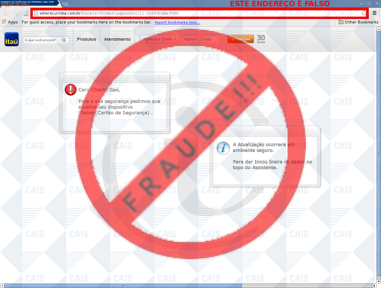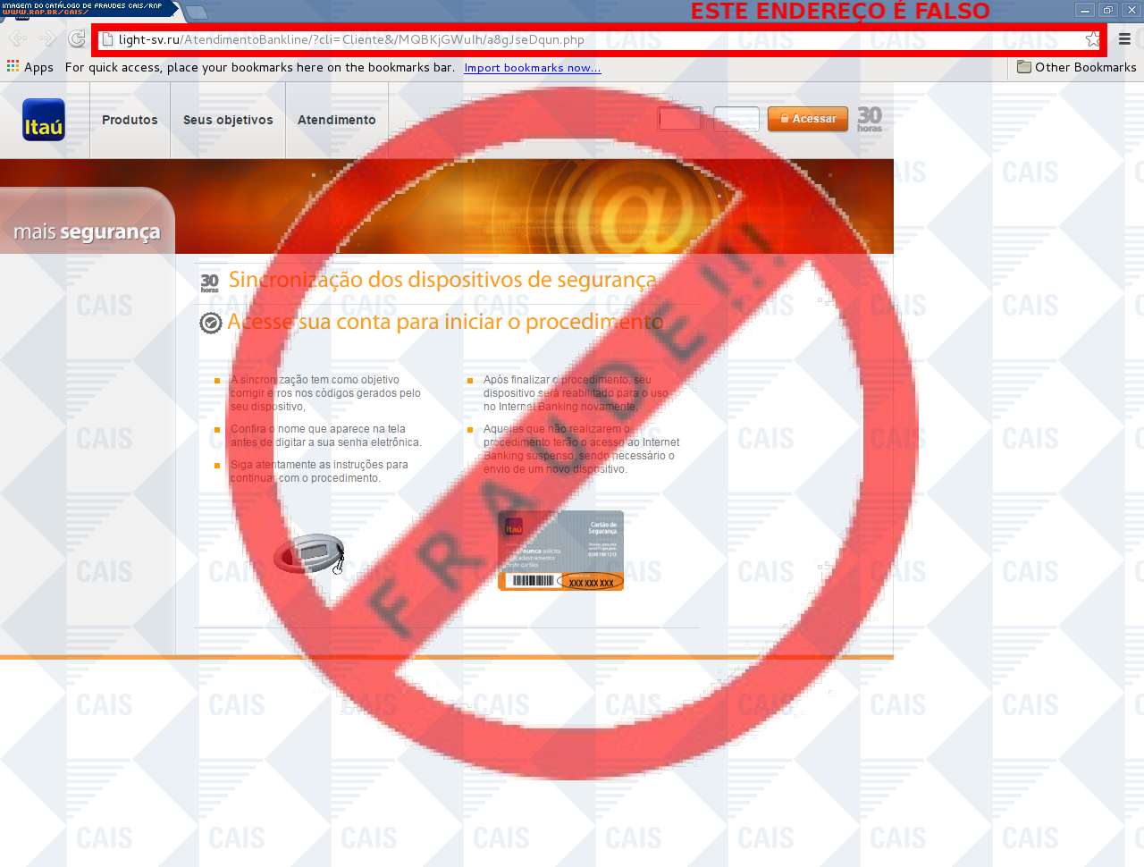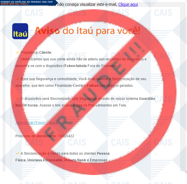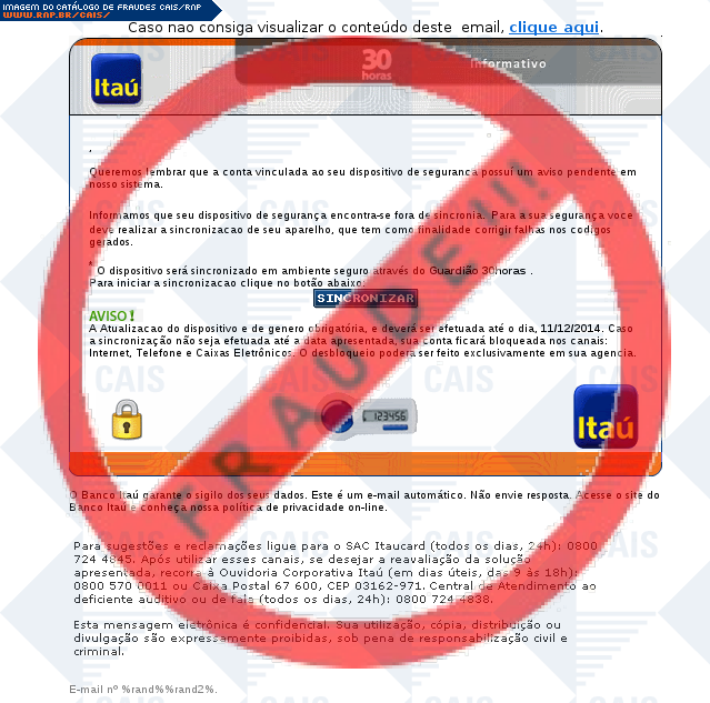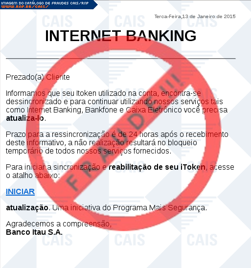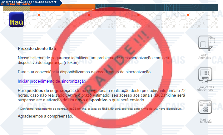 | comentário | A vítima recebe uma mensagem informando que seu seu dispositivo itoken não está sincronizado sendo necessário realizar a sincronização no link disponível, entretanto a página é falsa criada para roubar os dados bancários do usuário. | |