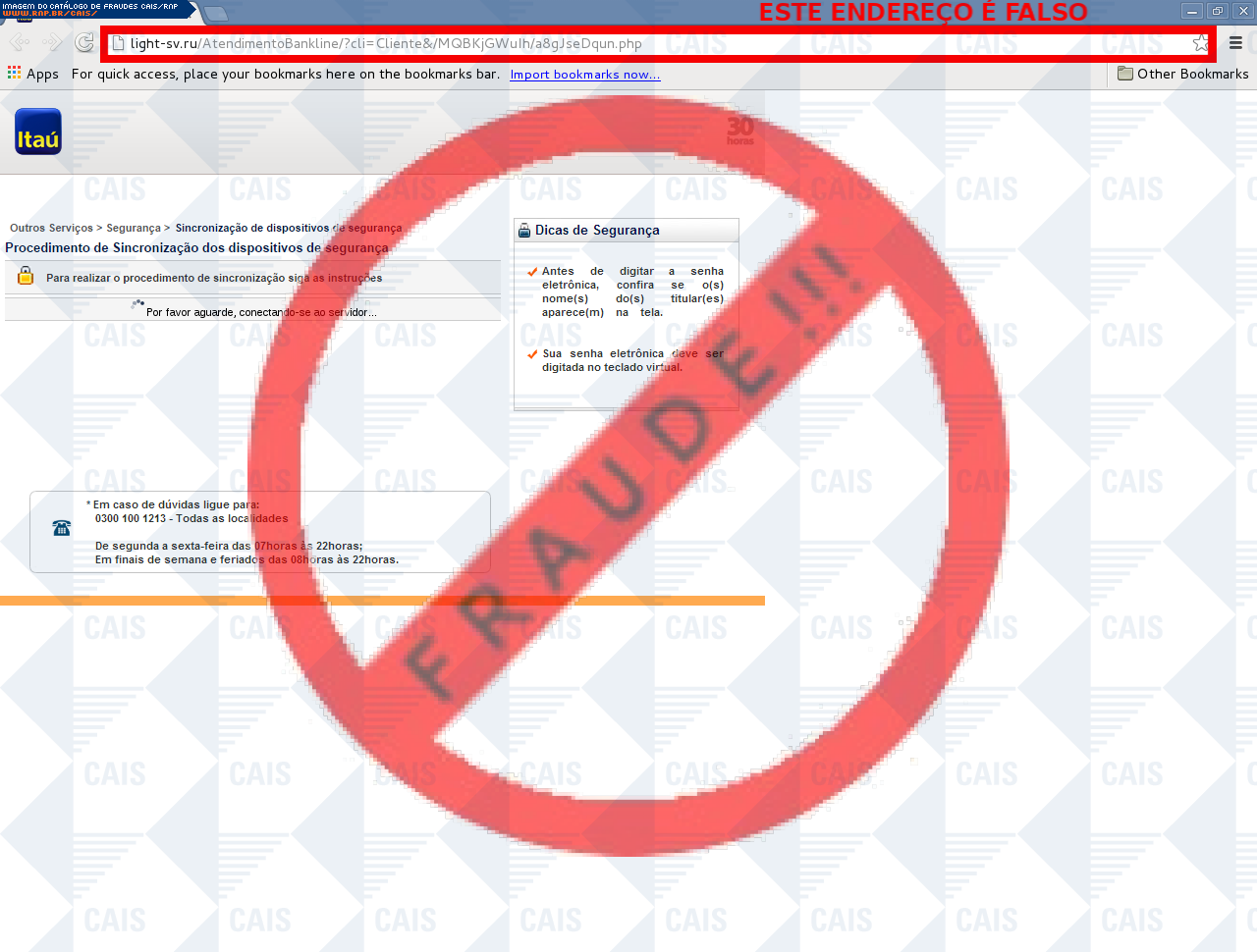 | comentário | A vítima recebe uma mensagem informando que seu dispositivo de segurança do banco Itaú não está sincronizado sendo necessário realizar a sincronização no link disponível, entretanto a página é falsa criada para roubar os dados bancários do usuário. | |