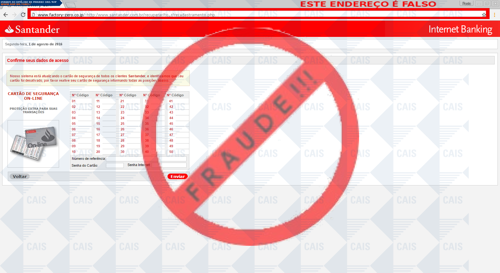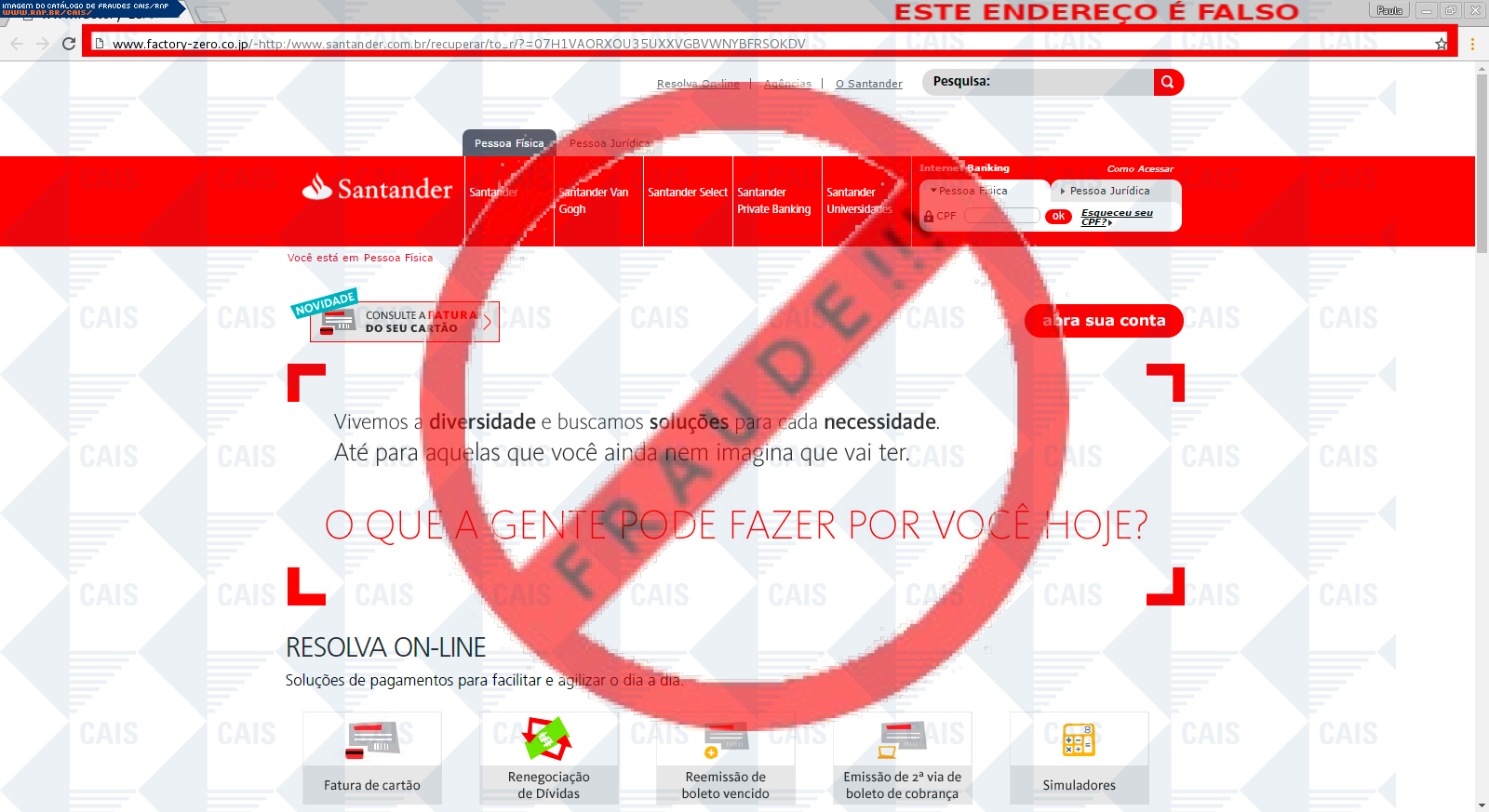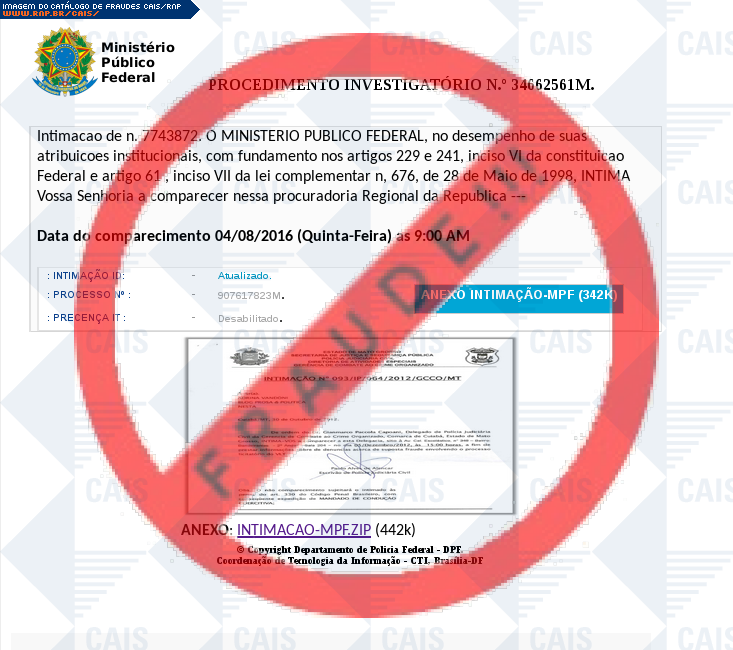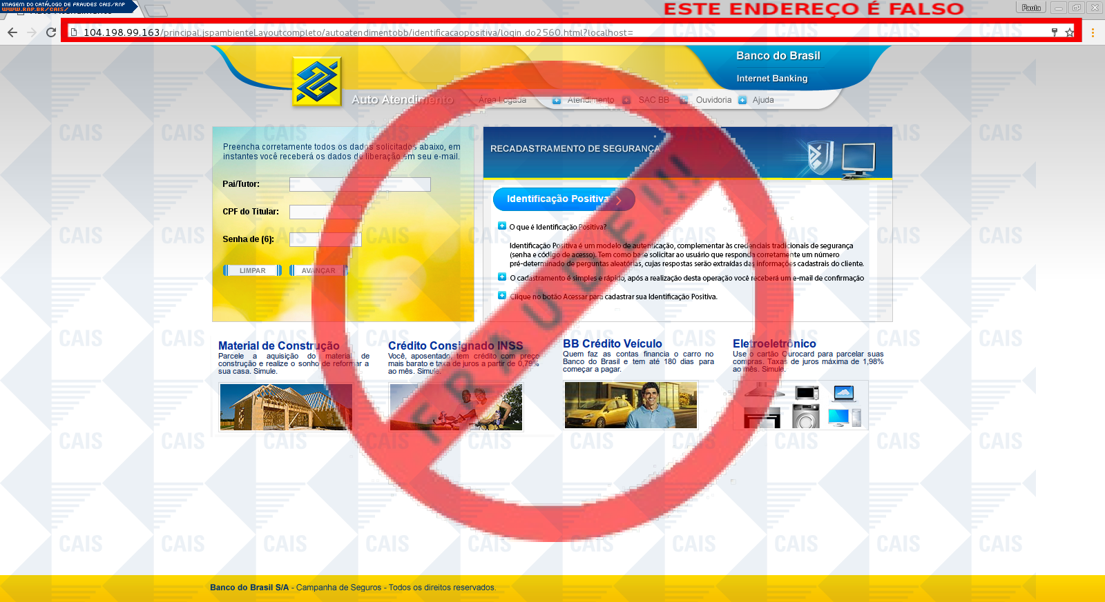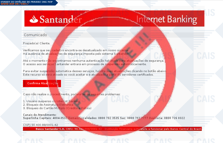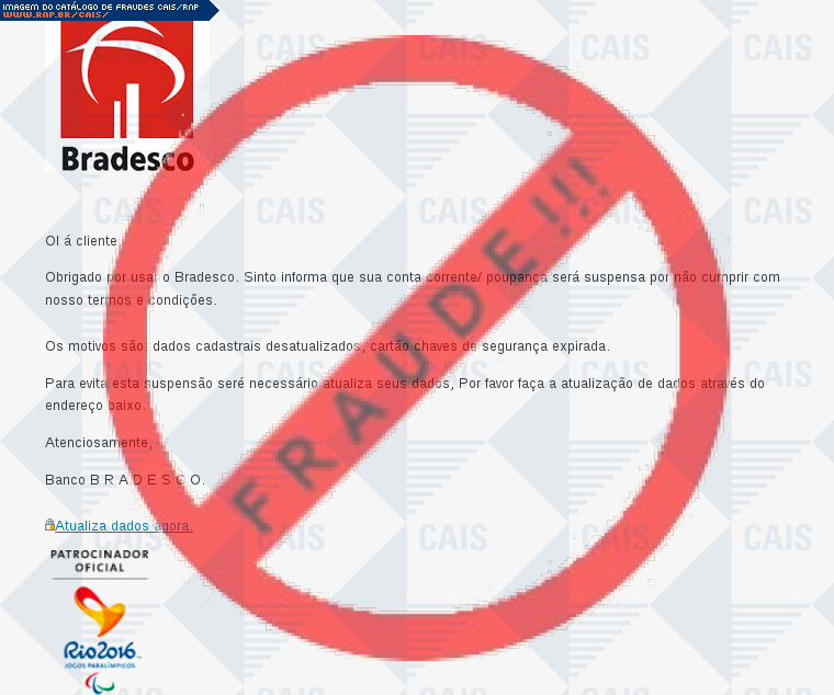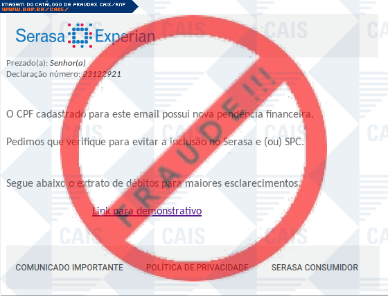 Esta página tem função informativa e educativa. Exibe uma coleção de imagens de phishing scam (fraudes eletrônicas) ou malware (código malicioso) veiculados por meio de spam (e-mail não-solicitado). Trata-se de conteúdo exemplificativo, não exaustivo, uma vez que não é possível contemplar todos os casos de fraudes existentes. Assim, caso você tenha conhecimento de um exemplar que não esteja aqui presente, isto não significa que não seja válido ou real. Inclusive incentivamos que você o envie para análise do CAIS para que, se for o caso, passe a integrar o nosso acervo.