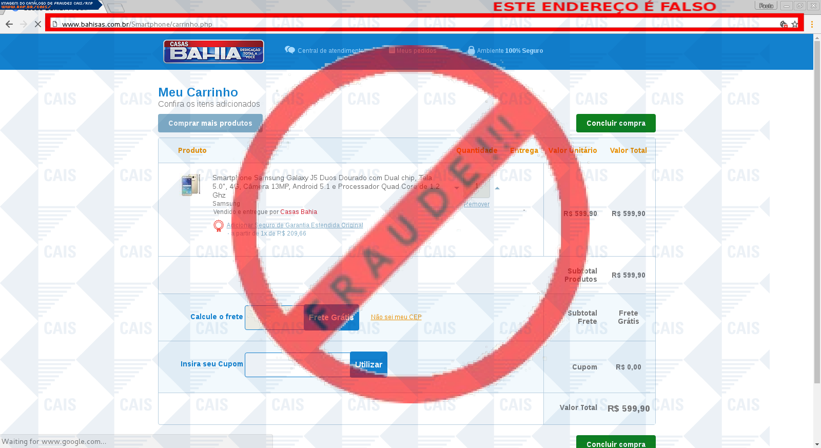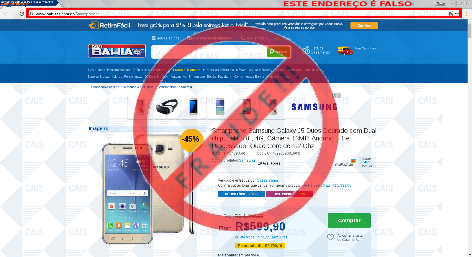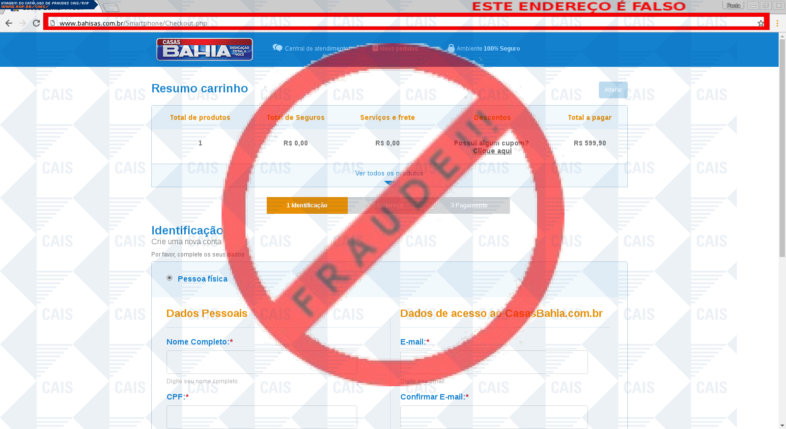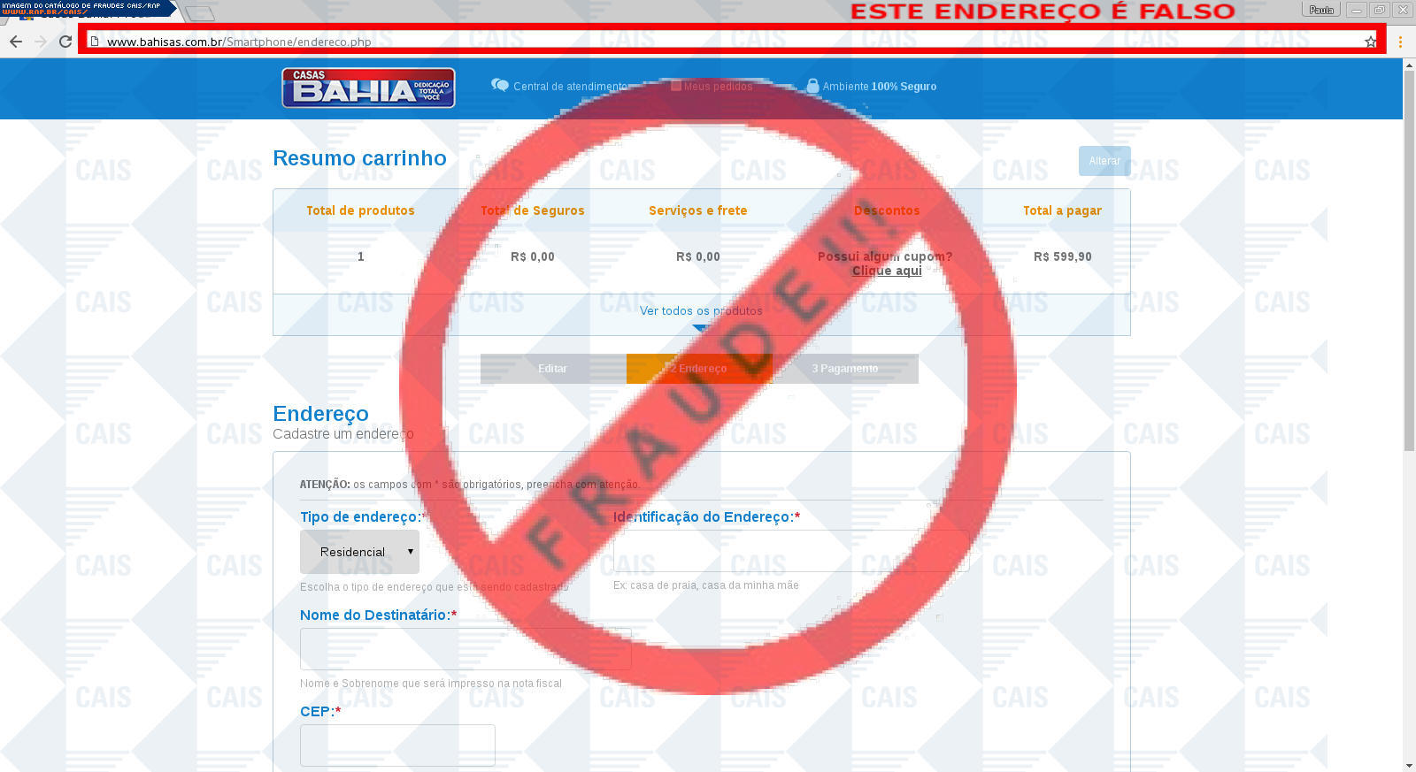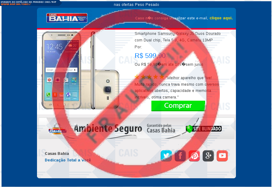 | comentário | A vítima recebe um e-mail informando sobre promoções de smartphone no site de compra da Casas Bahia disponibilizando link de vários produtos em desconto, no entanto a página é falsa destinada a roubar as informações pessoais e do cartão de crédito/débito... (leia mais) | |