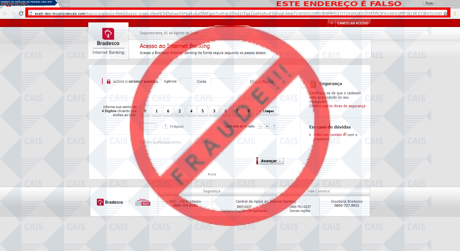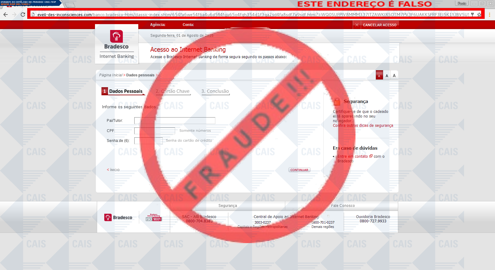 | comentário | A vítima recebe uma mensagem informando que sua conta no banco Bradesco está com o cadastro desatualizado sendo necessário realizar a atualização no link disponibilizado ou a conta será bloqueada, no entanto a página é falsa destinada a roubar as informações... (leia mais) | |