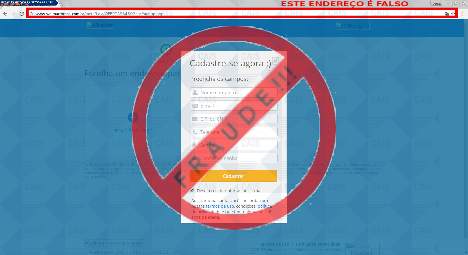 | comentário | A vítima recebe um e-mail informando sobre promoções no site de compra da Walmart disponibilizando link de vários produtos em desconto, no entanto a página é falsa destinada a roubar as informações pessoais e do cartão de crédito/débito do usuário. | |