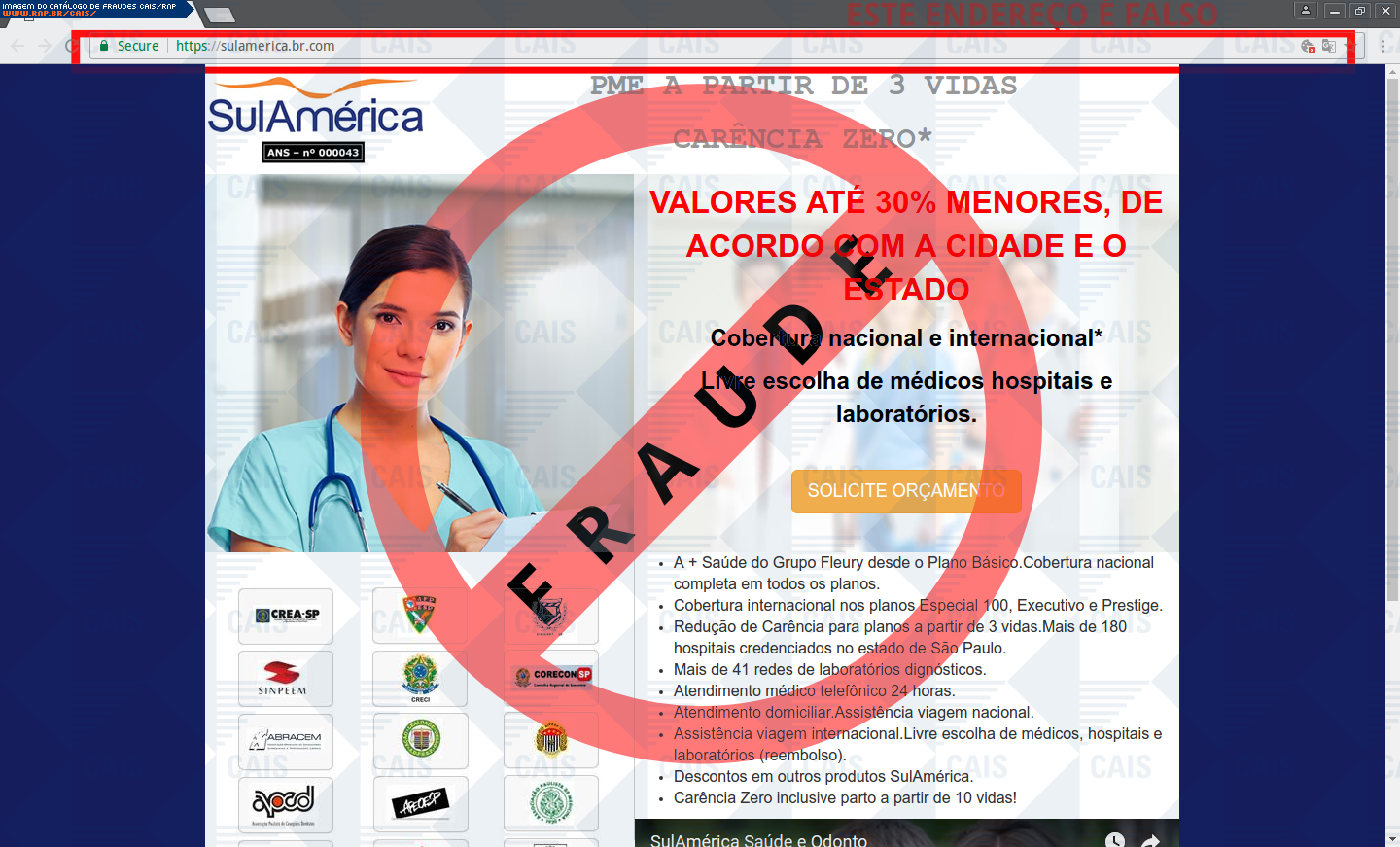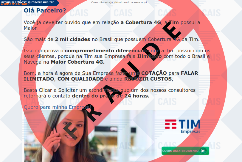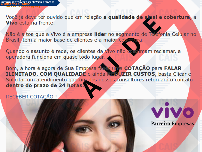 Esta página tem função informativa e educativa. Exibe uma coleção de imagens de phishing scam (fraudes eletrônicas) ou malware (código malicioso) veiculados por meio de spam (e-mail não-solicitado). Trata-se de conteúdo exemplificativo, não exaustivo, uma vez que não é possível contemplar todos os casos de fraudes existentes. Assim, caso você tenha conhecimento de um exemplar que não esteja aqui presente, isto não significa que não seja válido ou real. Inclusive incentivamos que você o envie para análise do CAIS para que, se for o caso, passe a integrar o nosso acervo.