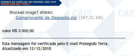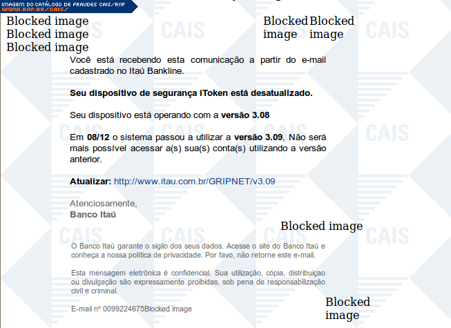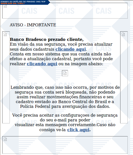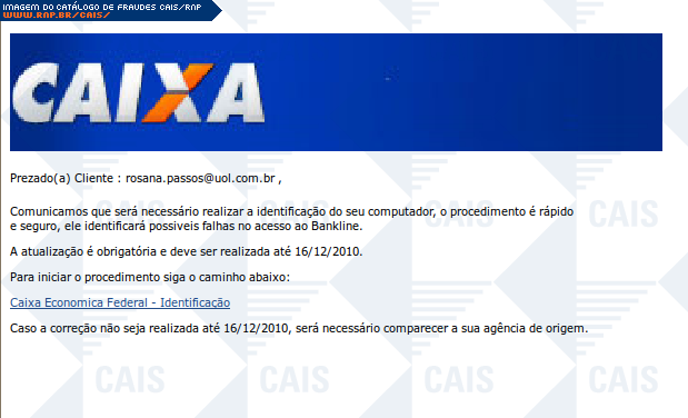 Esta página tem função informativa e educativa. Exibe uma coleção de imagens de phishing scam (fraudes eletrônicas) ou malware (código malicioso) veiculados por meio de spam (e-mail não-solicitado). Trata-se de conteúdo exemplificativo, não exaustivo, uma vez que não é possível contemplar todos os casos de fraudes existentes. Assim, caso você tenha conhecimento de um exemplar que não esteja aqui presente, isto não significa que não seja válido ou real. Inclusive incentivamos que você o envie para análise do CAIS para que, se for o caso, passe a integrar o nosso acervo.