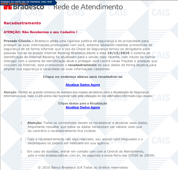 | comentário | Comunicado falso do banco Bradesco informando que o sistema de identificação do Internet Banking foi atualizado para a versão mais recente e pede que a vítima recadastre seus dados. Podemos notar que o endereço de origem da mensagem é central@namorando.com.br.... (leia mais) | |