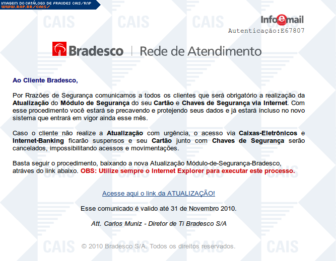 | comentário | Mensagem falsa do banco Bradesco solicitando a atualização do seu Módulo de Segurança Bradesco. A mensagem contém um link para a suposta atualização e ainda pede que seja utilizado o navegador Internet Explorer. O link leva a conteúdo malicioso que não estava... (leia mais) | |
