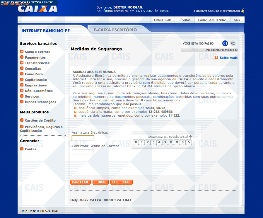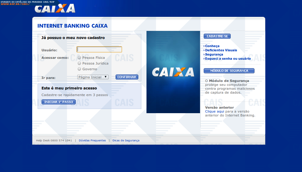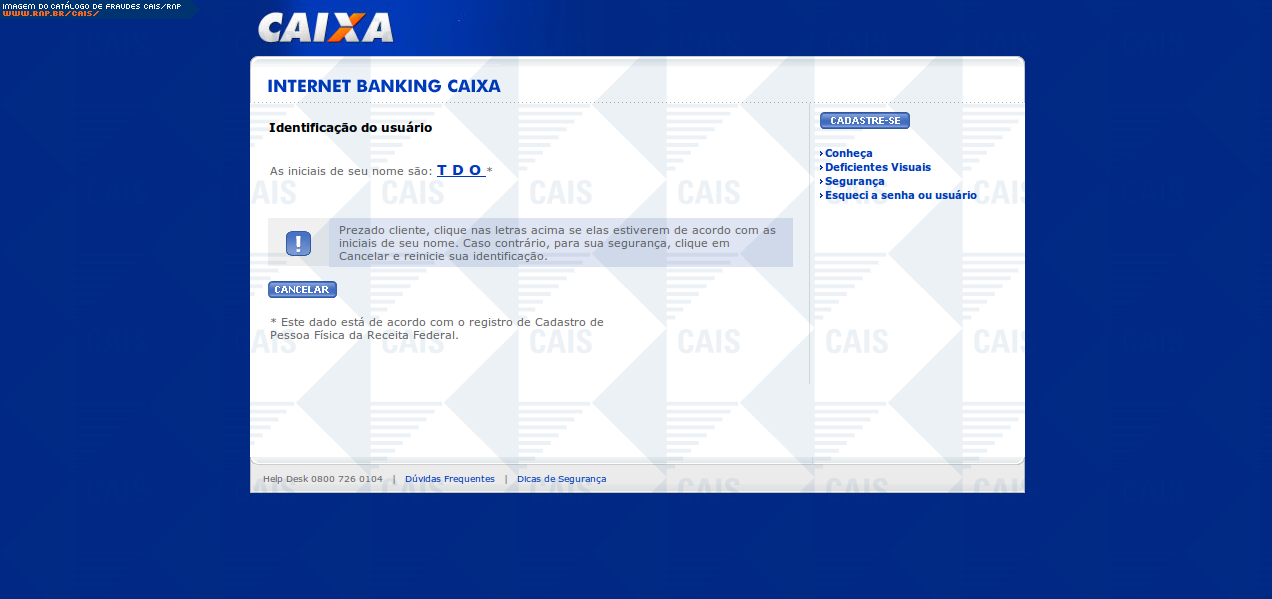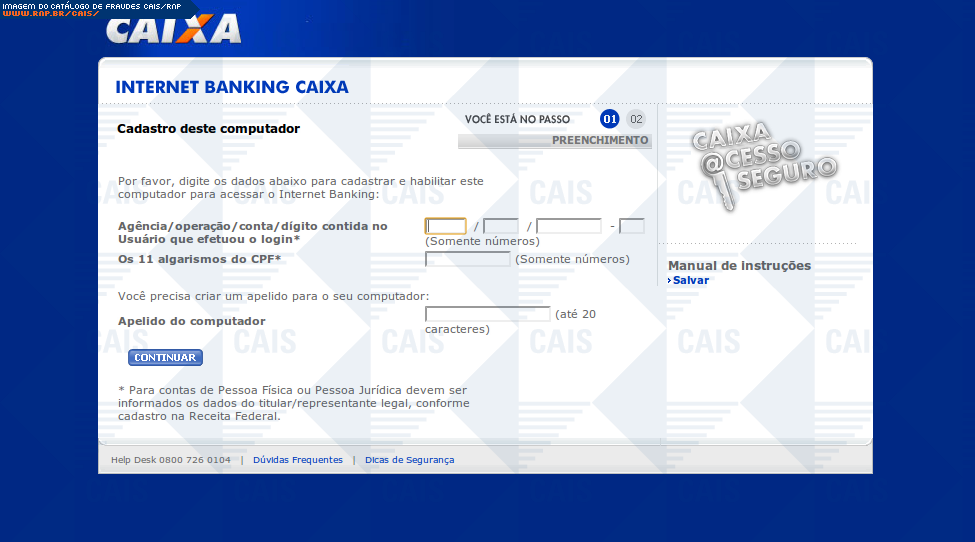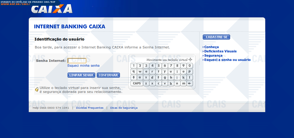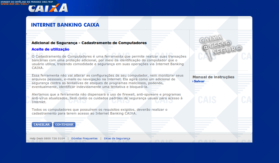 | comentário | Comunicado falso da Caixa Econômica Federal informando que será necessário realizar a identificação do computador da vítima para identificar possíveis falhas no acesso ao Bankline. A fraude contém um link que leva a uma página falsa destinada a roubar os... (leia mais) | |