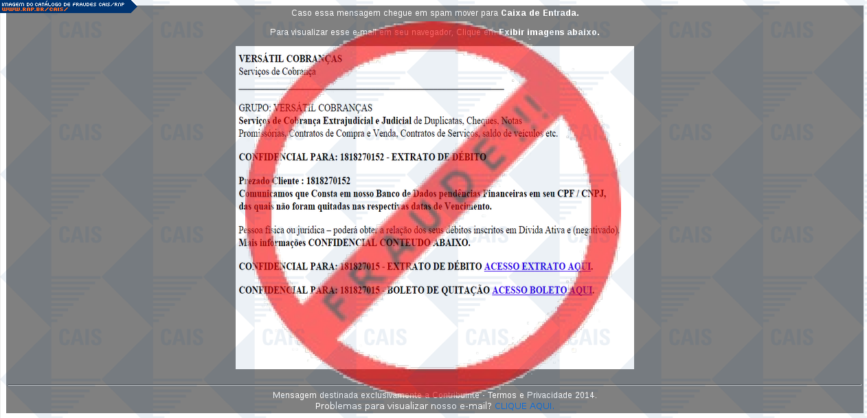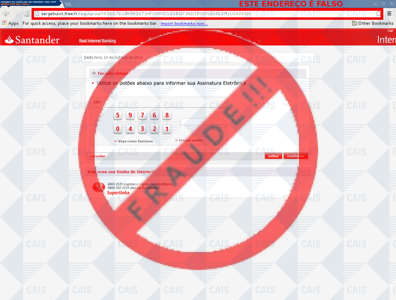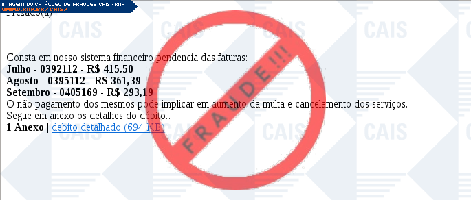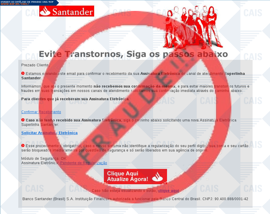 Esta página tem função informativa e educativa. Exibe uma coleção de imagens de phishing scam (fraudes eletrônicas) ou malware (código malicioso) veiculados por meio de spam (e-mail não-solicitado). Trata-se de conteúdo exemplificativo, não exaustivo, uma vez que não é possível contemplar todos os casos de fraudes existentes. Assim, caso você tenha conhecimento de um exemplar que não esteja aqui presente, isto não significa que não seja válido ou real. Inclusive incentivamos que você o envie para análise do CAIS para que, se for o caso, passe a integrar o nosso acervo.