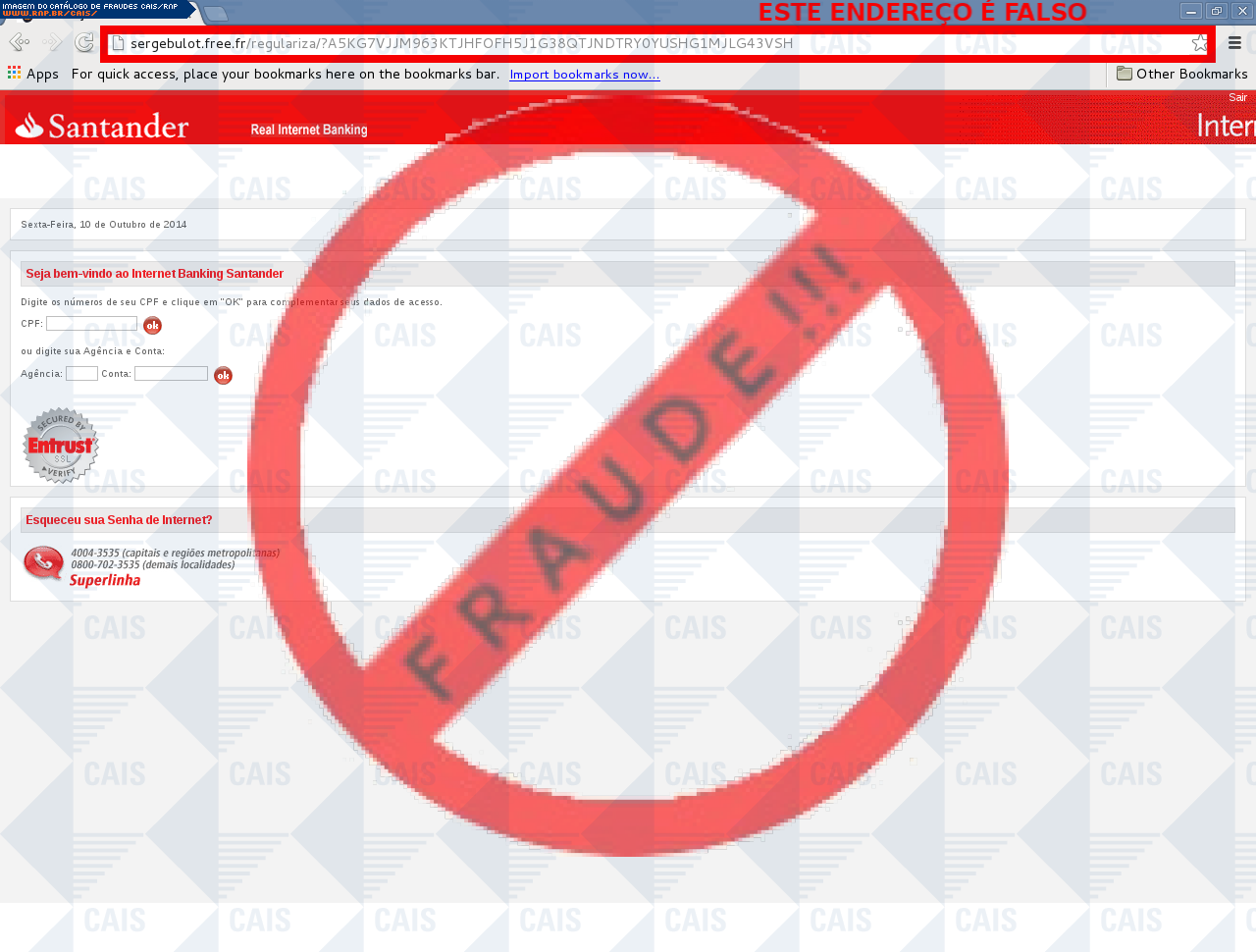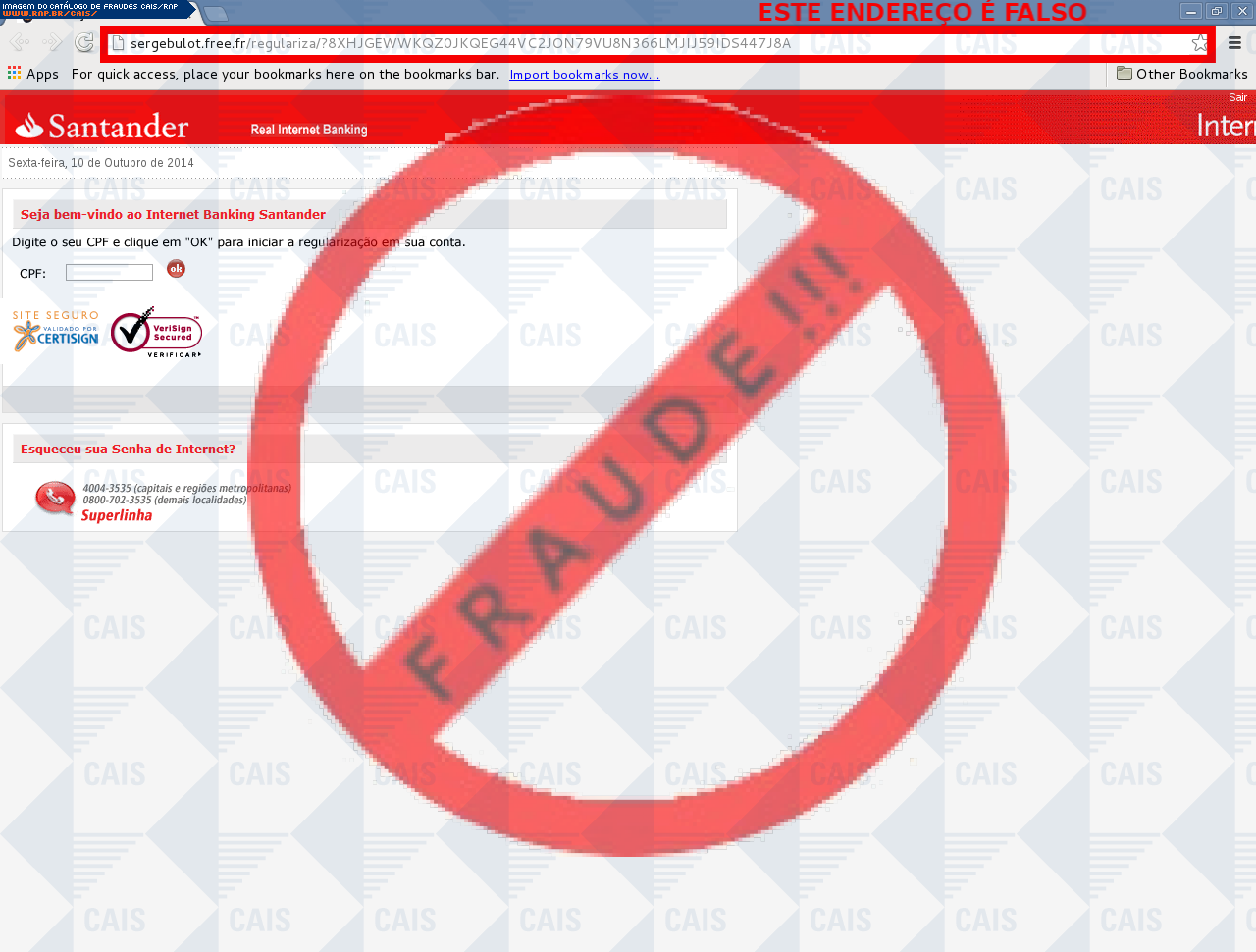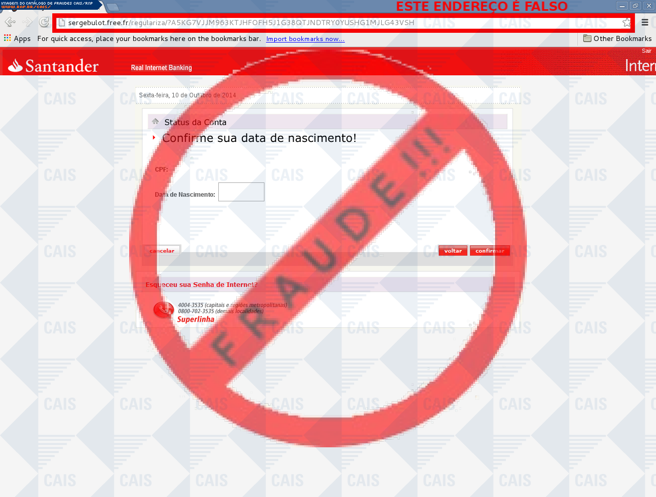 Esta página tem função informativa e educativa. Exibe uma coleção de imagens de phishing scam (fraudes eletrônicas) ou malware (código malicioso) veiculados por meio de spam (e-mail não-solicitado). Trata-se de conteúdo exemplificativo, não exaustivo, uma vez que não é possível contemplar todos os casos de fraudes existentes. Assim, caso você tenha conhecimento de um exemplar que não esteja aqui presente, isto não significa que não seja válido ou real. Inclusive incentivamos que você o envie para análise do CAIS para que, se for o caso, passe a integrar o nosso acervo.