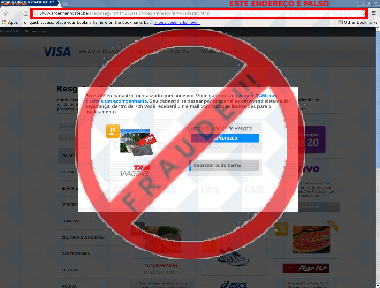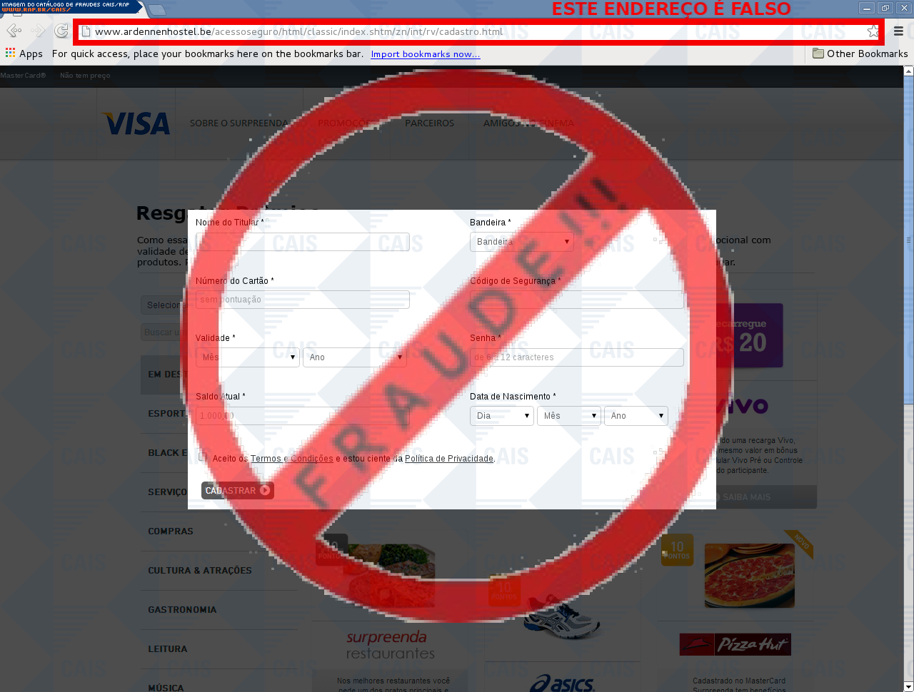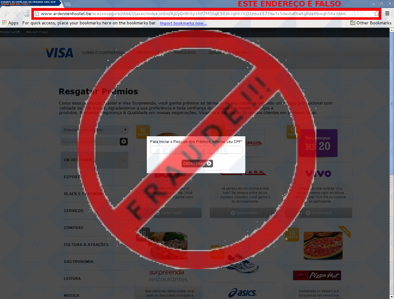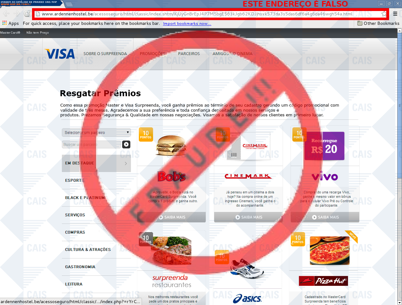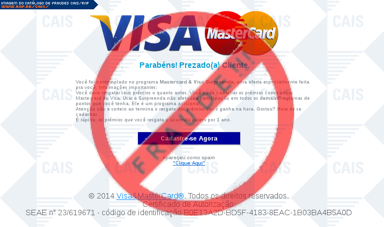 | comentário | A vítima recebe um e-mail informando sobre os benefícios do programa MasterCard Surpreenda do cartão Visa disponibilizando o link para cadastro, no entanto a página é falsa criada para roubar as informações do cartão da vítima. | |