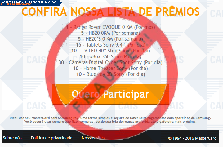 | comentário | A vítima recebe um e-mail informando sobre as vantagens da promoção compra premiada do cartão Mastercard sendo o cadastro através do link disponibilizado, no entanto a página é falsa criada para roubar informações do usuário. | |