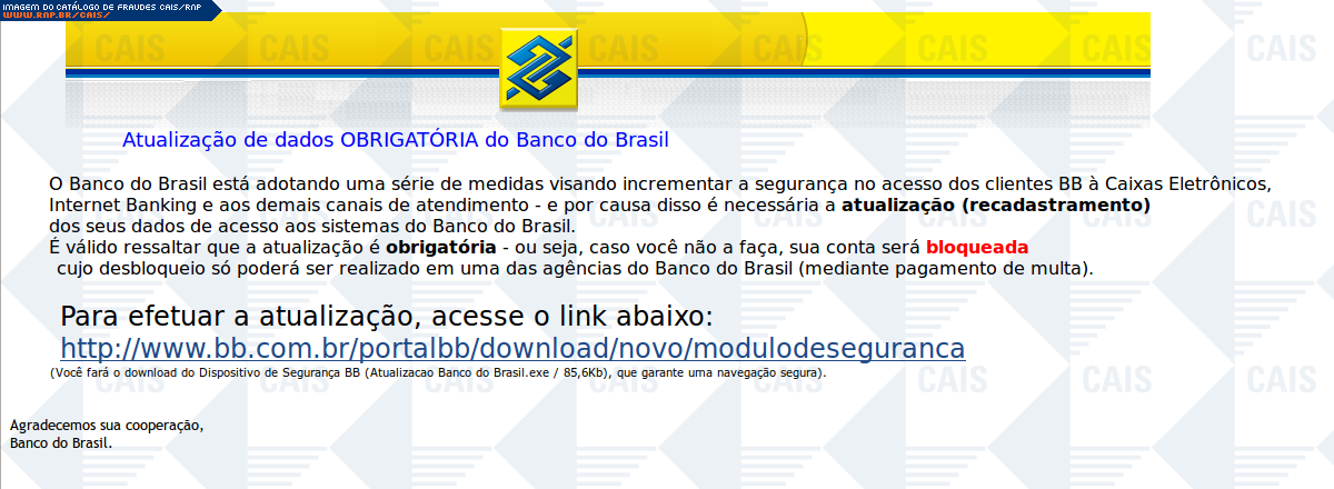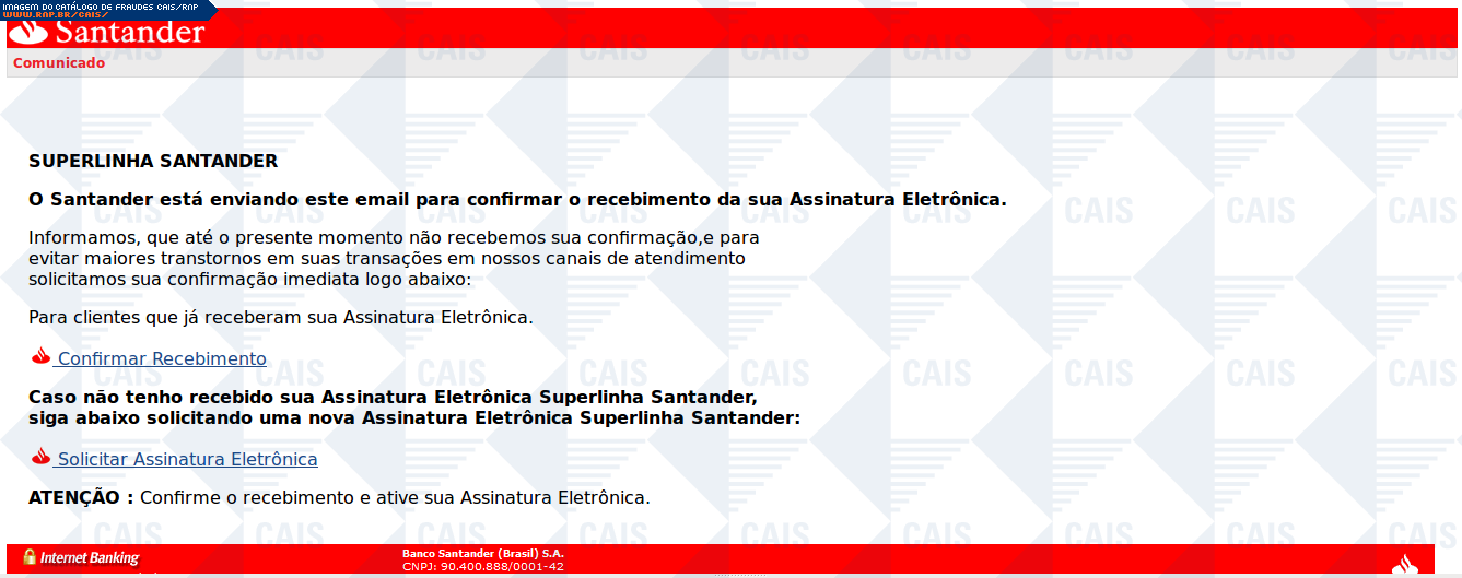 Esta página tem função informativa e educativa. Exibe uma coleção de imagens de phishing scam (fraudes eletrônicas) ou malware (código malicioso) veiculados por meio de spam (e-mail não-solicitado). Trata-se de conteúdo exemplificativo, não exaustivo, uma vez que não é possível contemplar todos os casos de fraudes existentes. Assim, caso você tenha conhecimento de um exemplar que não esteja aqui presente, isto não significa que não seja válido ou real. Inclusive incentivamos que você o envie para análise do CAIS para que, se for o caso, passe a integrar o nosso acervo.