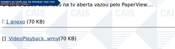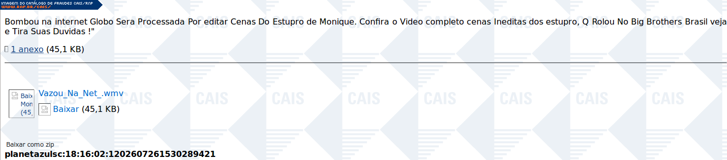 | comentário | A fraude contém um link para um suposto vídeo com imagens do payperview do Big Brother. O conteúdo malicioso não estava disponível no momento da análise. | |
