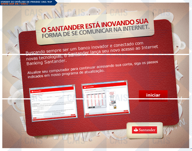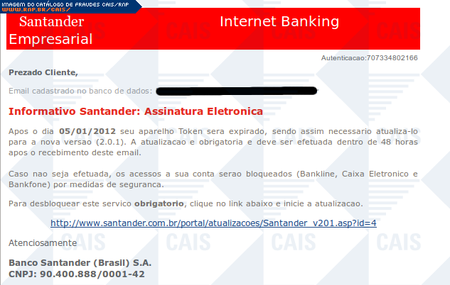 | comentário | Mensagem falsa, em nome do banco Santander, informando sobre o novo acesso ao Internet Banking. A fraude contém um link para a que a vítima realize a atualização de seu computador. O conteúdo malicioso não estava disponível no momento da análise. | |