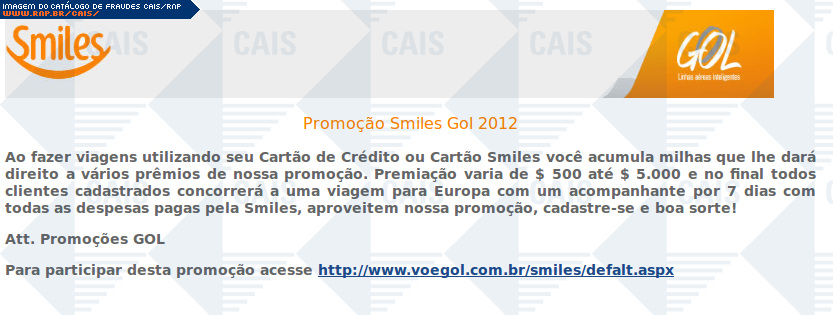 | comentário | A fraude contém um link para o cadastro em uma promoção da GOL. O conteúdo malicioso não estava disponível no momento da análise. | |