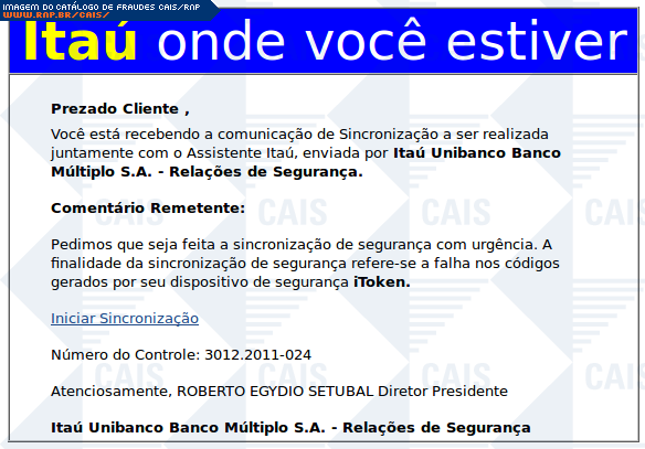 | comentário | O comunicado falso, em nome do banco Itaú, contém um link para a realização de uma suposta sincronização. O conteúdo malicioso não estava disponível no momento da análise. | |