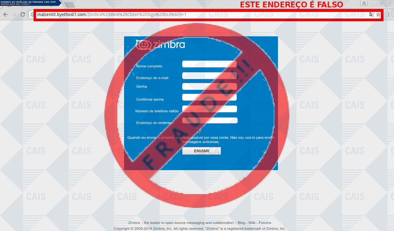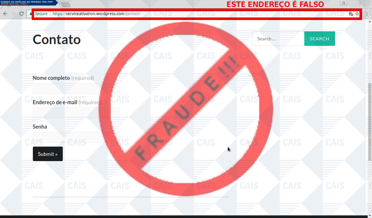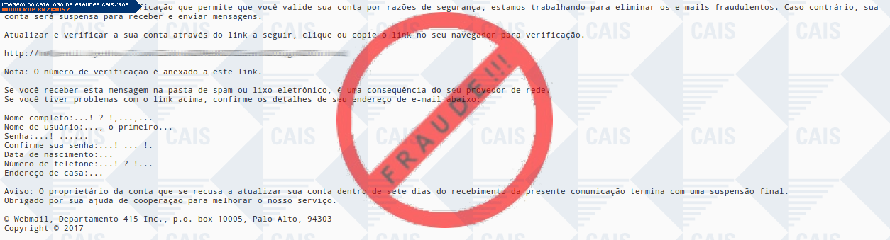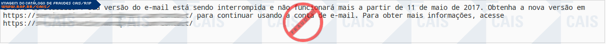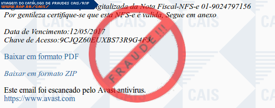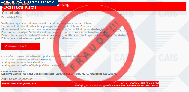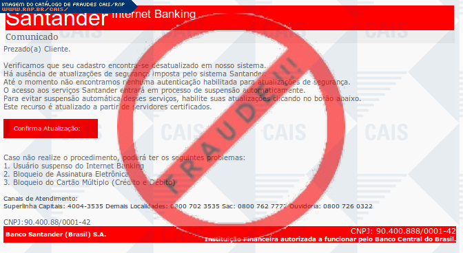 Esta página tem função informativa e educativa. Exibe uma coleção de imagens de phishing scam (fraudes eletrônicas) ou malware (código malicioso) veiculados por meio de spam (e-mail não-solicitado). Trata-se de conteúdo exemplificativo, não exaustivo, uma vez que não é possível contemplar todos os casos de fraudes existentes. Assim, caso você tenha conhecimento de um exemplar que não esteja aqui presente, isto não significa que não seja válido ou real. Inclusive incentivamos que você o envie para análise do CAIS para que, se for o caso, passe a integrar o nosso acervo.