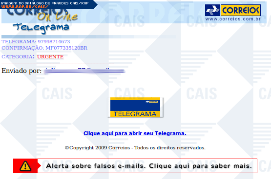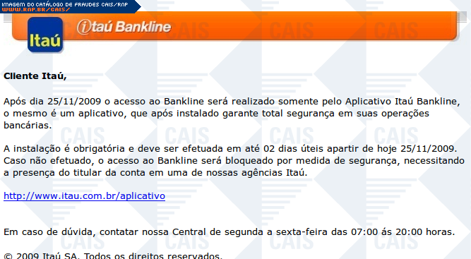 Esta página tem função informativa e educativa. Exibe uma coleção de imagens de phishing scam (fraudes eletrônicas) ou malware (código malicioso) veiculados por meio de spam (e-mail não-solicitado). Trata-se de conteúdo exemplificativo, não exaustivo, uma vez que não é possível contemplar todos os casos de fraudes existentes. Assim, caso você tenha conhecimento de um exemplar que não esteja aqui presente, isto não significa que não seja válido ou real. Inclusive incentivamos que você o envie para análise do CAIS para que, se for o caso, passe a integrar o nosso acervo.