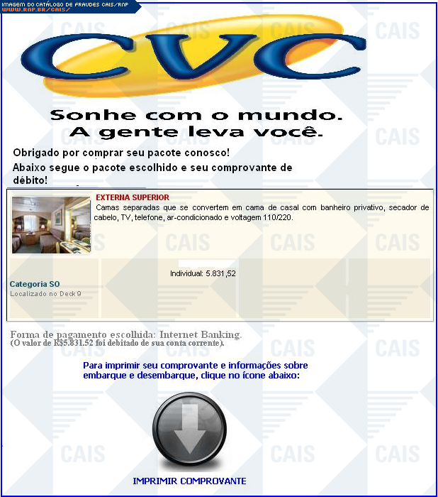 | comentário | Mensagem falsa se passando pela empresa CVC confirmando suposta compra de pacote de viagens no valor de R$ 5831,00. A fraude fornece um link para informações sobre o comprovante e embarque e desembarque. Tal link direciona a vítima para um software malicioso... (leia mais) | |