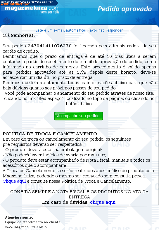 | comentário | Mensagem se passando pelo Magazine Luiza dizendo que o pagamento do pedido da vítima foi confirmado pela operadora de cartão de crédito e o produto já foi liberado. O texto dá algumas informações sobre prazo de entrega e política de troca de produtos e fornece... (leia mais) | |