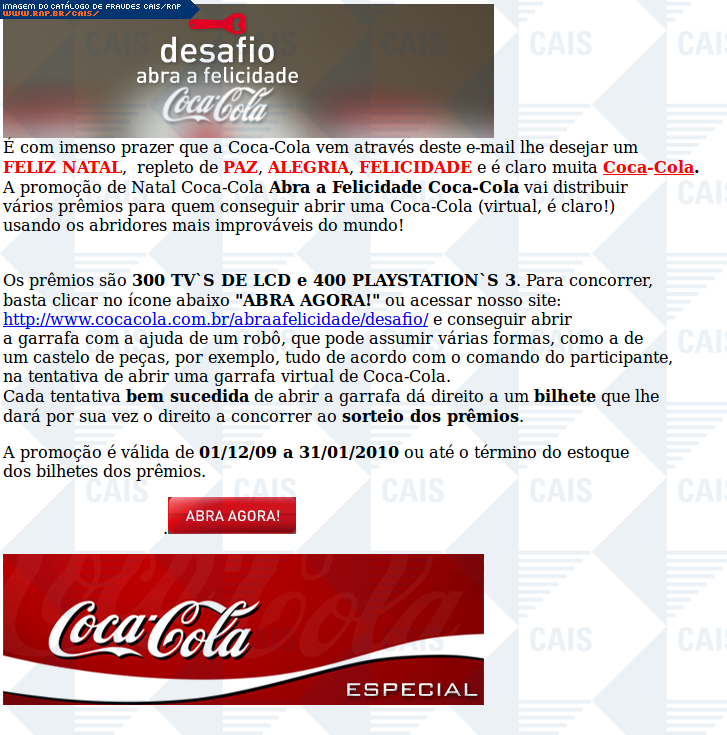 | comentário | Falsa promoção de Natal da Coca-Cola, instruindo o usuário a abrir um link para participação no sorteio de TV's LCD e Playstation's 3. O link aponta para o arquivo malicioso Trojan-Clicker.Win32.Delf (Ikarus). | |