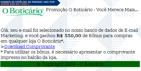 | comentário | Mensagem dizendo que a vítima foi selecionada em um banco de dados de e-mails para receber um bônus no valor de R$ 55,00 em compras nas lojas O Boticário. Para utilizar o bônus seria necessário imprimir um comprovante obtido através de um link fornecido na... (leia mais) | |