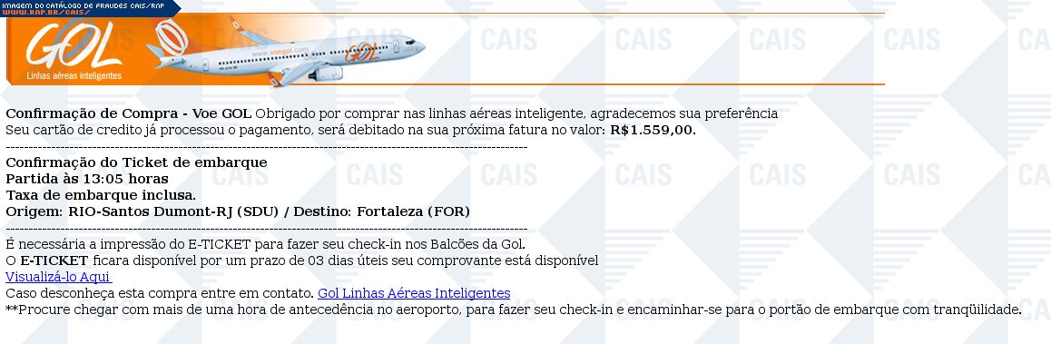 | comentário | Mensagem falsa se passando pela GOL confirmando compra de passagem do Rio de Janeiro para Fortaleza no valor de R$ 1559,00. O texto diz que o pagamento por cartão de crédito foi aceito e que o comprovante deve ser impresso. A fraude possui dois links: o primeiro... (leia mais) | |