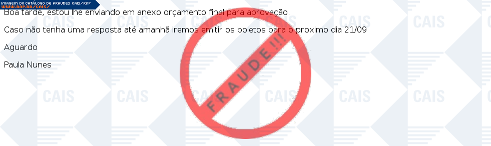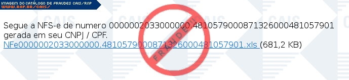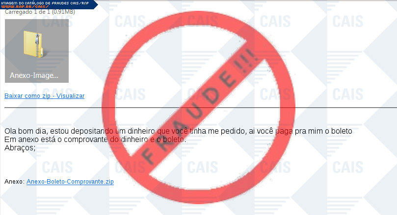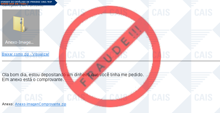 Esta página tem função informativa e educativa. Exibe uma coleção de imagens de phishing scam (fraudes eletrônicas) ou malware (código malicioso) veiculados por meio de spam (e-mail não-solicitado). Trata-se de conteúdo exemplificativo, não exaustivo, uma vez que não é possível contemplar todos os casos de fraudes existentes. Assim, caso você tenha conhecimento de um exemplar que não esteja aqui presente, isto não significa que não seja válido ou real. Inclusive incentivamos que você o envie para análise do CAIS para que, se for o caso, passe a integrar o nosso acervo.