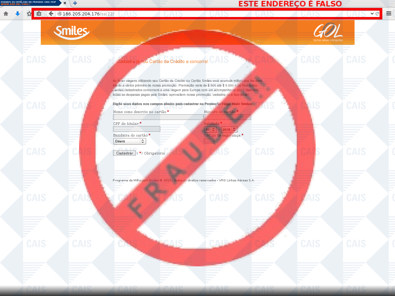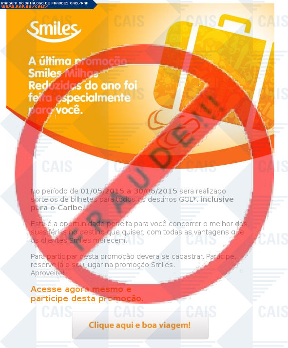 | comentário | O usuário recebe uma mensagem informando sobre o programa de pontos Smiles da companhia aérea Gol com o link para inscrição disponível. Entretanto o site é falso criado para roubar dados pessoais da vítima. | |
