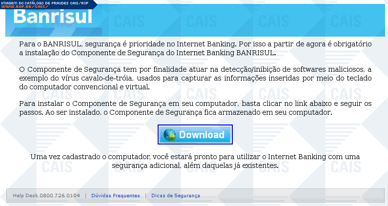 | comentário | Mensagem se passando pelo Banco Banrisul comunicando que passa a ser obrigatória a utilização do componente de segurança do banco para acesso ao Internet Banking do Banrisul. A fraude indica um link para baixar e instalar tal componente de segurança. O link... (leia mais) | |