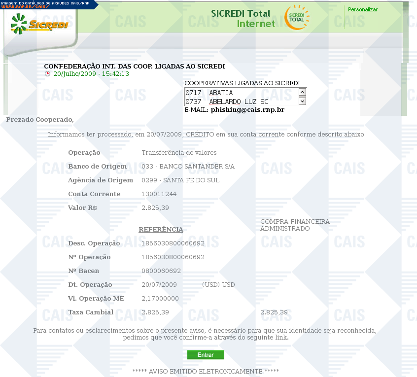 Esta página tem função informativa e educativa. Exibe uma coleção de imagens de phishing scam (fraudes eletrônicas) ou malware (código malicioso) veiculados por meio de spam (e-mail não-solicitado). Trata-se de conteúdo exemplificativo, não exaustivo, uma vez que não é possível contemplar todos os casos de fraudes existentes. Assim, caso você tenha conhecimento de um exemplar que não esteja aqui presente, isto não significa que não seja válido ou real. Inclusive incentivamos que você o envie para análise do CAIS para que, se for o caso, passe a integrar o nosso acervo.