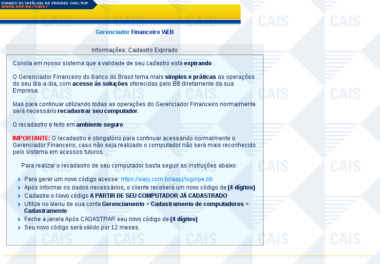 | comentário | Mensagem falsa se passando pelo Banco do Brasil comunicando que o cadastro da vítima para acesso ao Internet Banking está expirado. Para a correção do problema é pedido que seja instalado o Gerenciador Financeiro do banco e que seja feito o recadastro em... (leia mais) | |