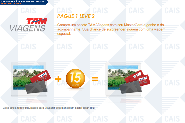 | comentário | A fraude usa o nome da TAM e Mastercard para enviar um link para o cadastro em uma promoção. O link leva a um site falso, destinado a roubar dados do cartão de crédito da vítima. | |