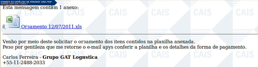| comentário | A mensagem contém um link para uma planilha de itens para a realização de um orçamento. O arquivo é malicioso e foi identificado como UDS:DangerousObject.Multi.Generic (Kaspersky). | |