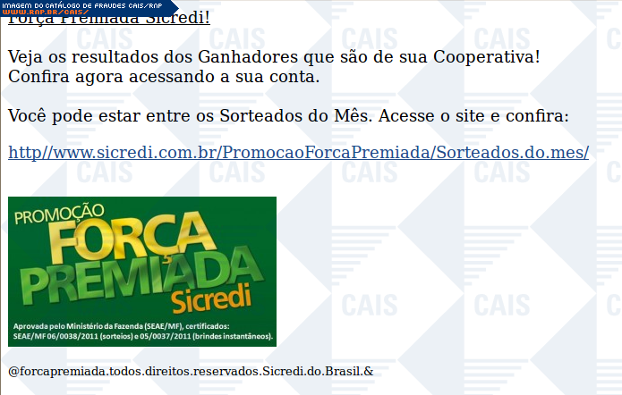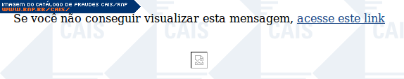 Esta página tem função informativa e educativa. Exibe uma coleção de imagens de phishing scam (fraudes eletrônicas) ou malware (código malicioso) veiculados por meio de spam (e-mail não-solicitado). Trata-se de conteúdo exemplificativo, não exaustivo, uma vez que não é possível contemplar todos os casos de fraudes existentes. Assim, caso você tenha conhecimento de um exemplar que não esteja aqui presente, isto não significa que não seja válido ou real. Inclusive incentivamos que você o envie para análise do CAIS para que, se for o caso, passe a integrar o nosso acervo.