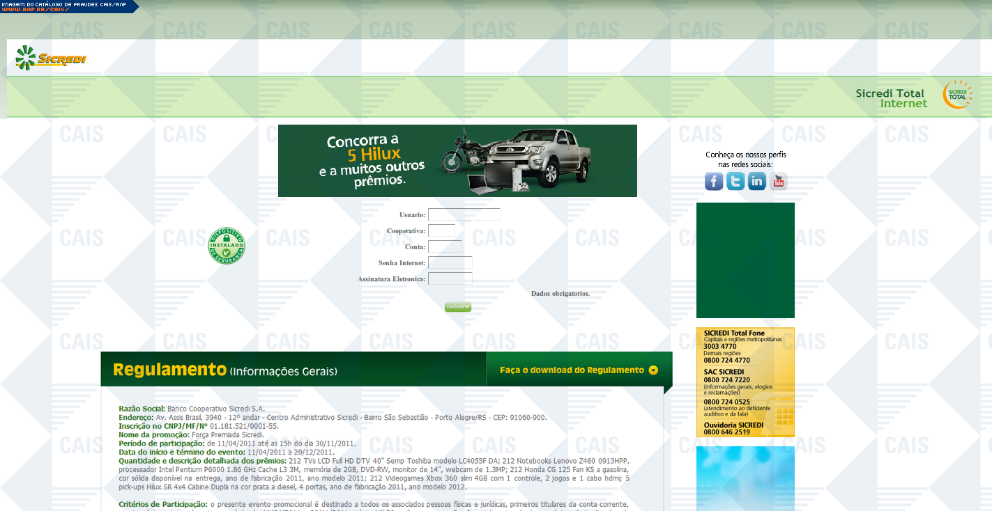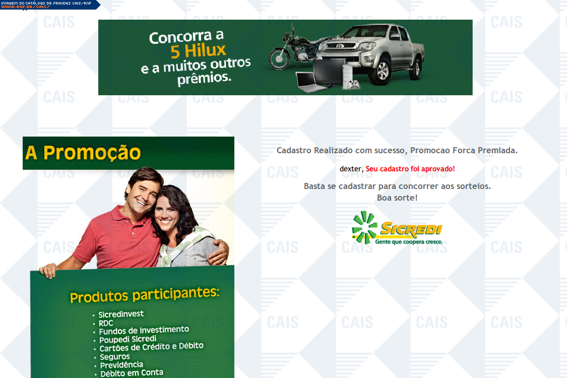 | comentário | A mensagem em, nome da Sicredi, contém um link para o resultado de uma suposta promoção. O link leva a uma página falsa destinada a roubar dados da conta da vítima. | |