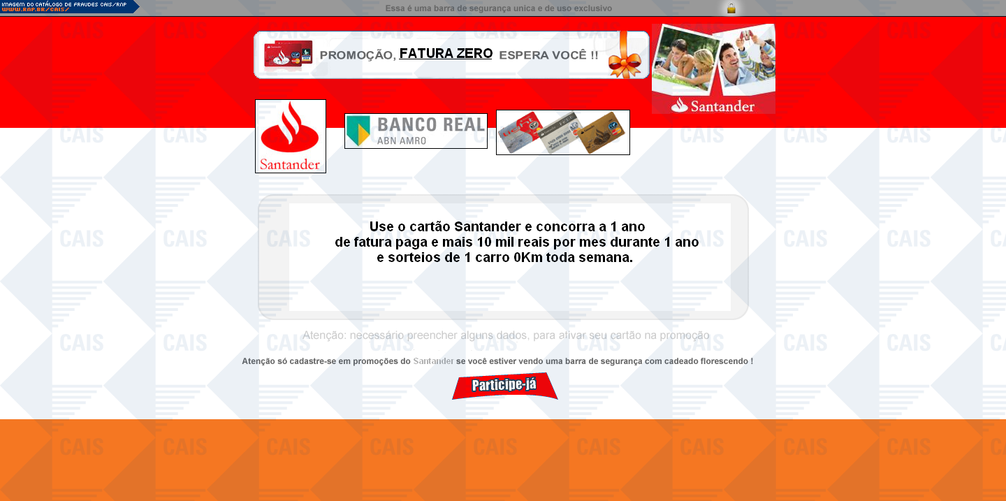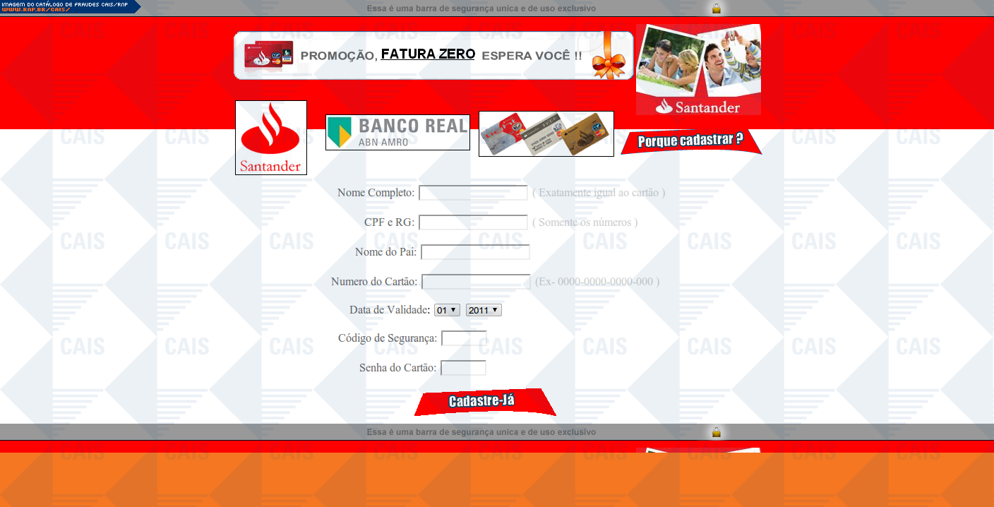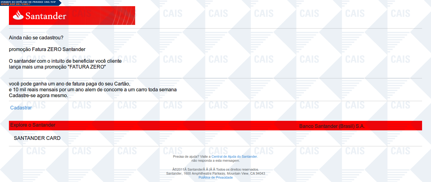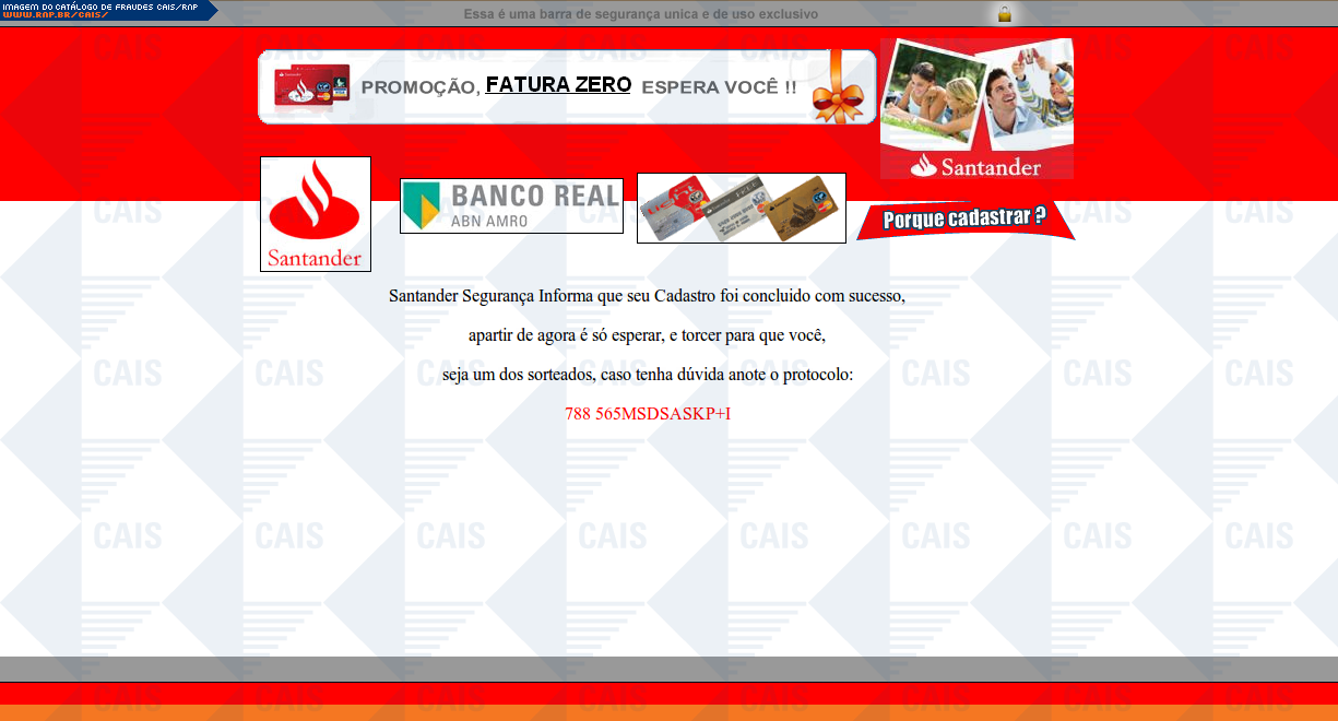 | comentário | Mensagem falsa em que o banco Santander estaria anunciando a promoção Fatura Zero. O link para o cadastro na promoção leva a uma página falsa, destinada a coletar da do cartão de crédito da vítima. | |