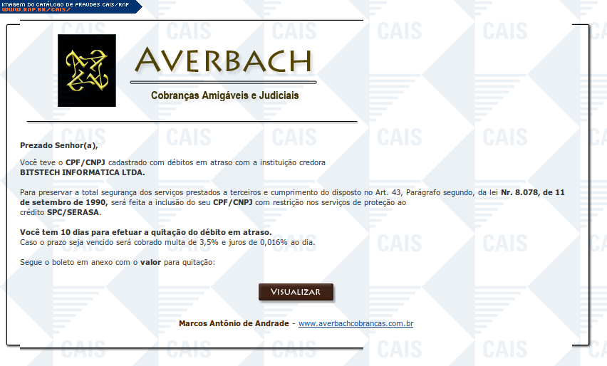 | comentário | A mensagem, em nome da Averbach, se passa pelo envio de um boleto atrasado. O arquivo é malicioso e foi identificado como Gen:Trojan.Heur.tmKfr1!vWIeOz (BitDefender). | |