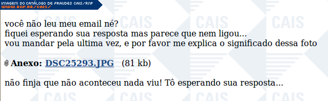 | comentário | A mensagem contém um link para uma foto do que parecer ser algum tipo de traição que teria sido cometida pela vítima. O link leva a um software malicioso que foi identificado como Backdoor.Rbot (Ikarus). | |