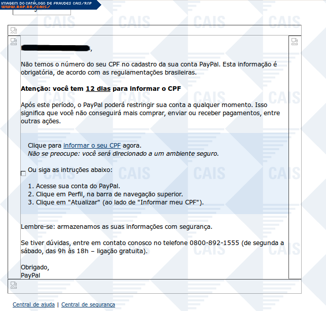 | comentário | A mensagem, em nome do PayPal pede que a vítima informe seu CPF para completar seu cadastro no site. O conteúdo malicioso não estava diponível no momento da análise. | |