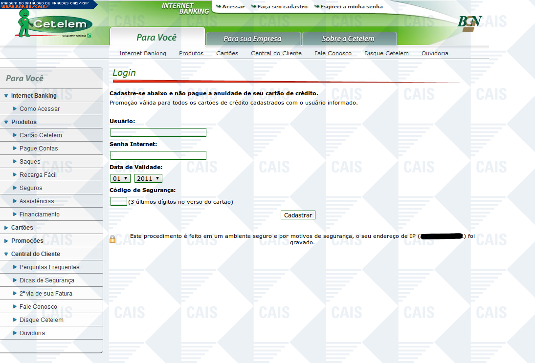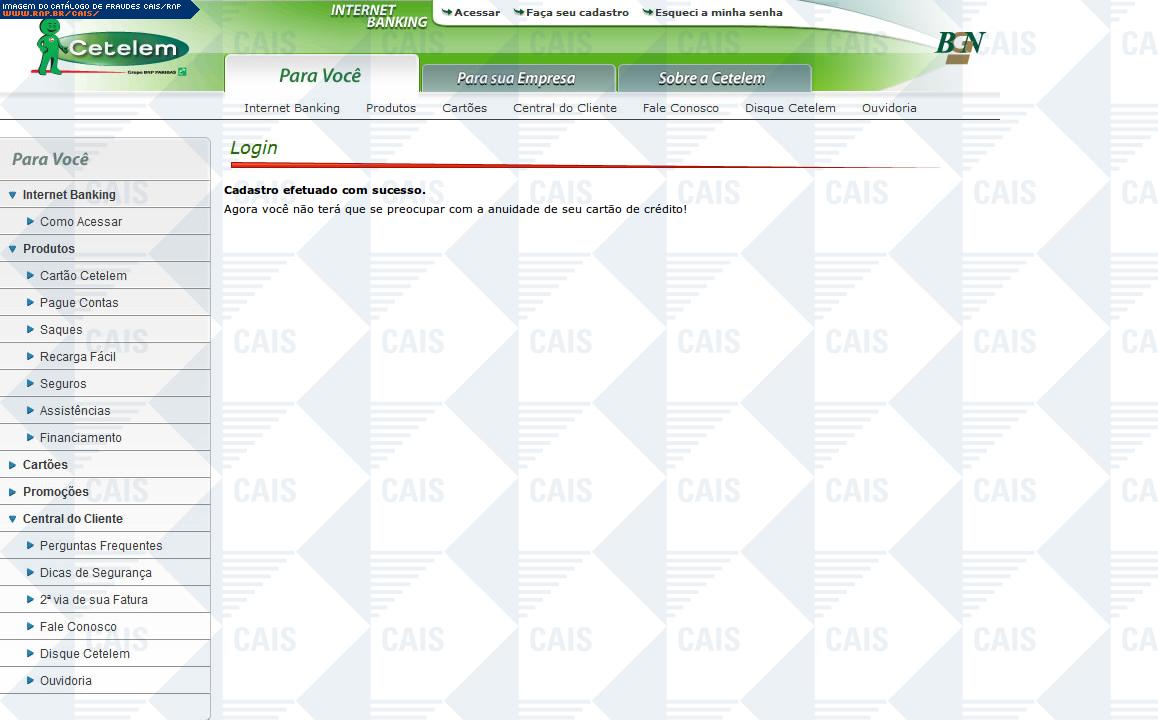 | comentário | A fraude contém um link para o cadastro no programa "Anuidade zero" do banco Cetelem. O link leva a uma página falsa, destinada a roubar dados da conta da vítima. | |