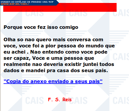 | comentário | A mensagem contém um link para as provas de uma possível traição, cometida pela vítima. O link leva a um arquivo malicioso que foi identificado como Trojan-Downloader.Win32.Delf (Ikarus). | |
