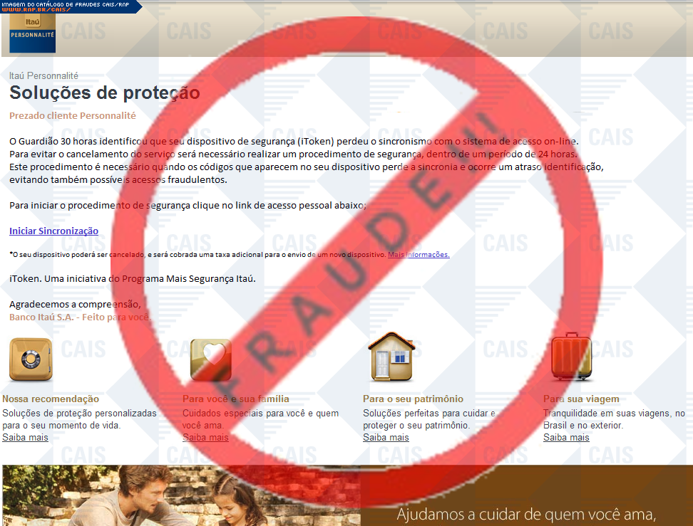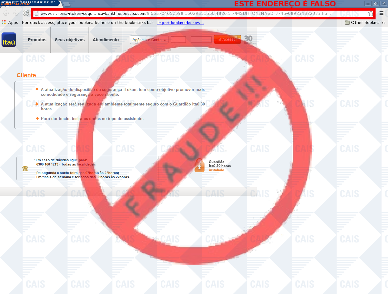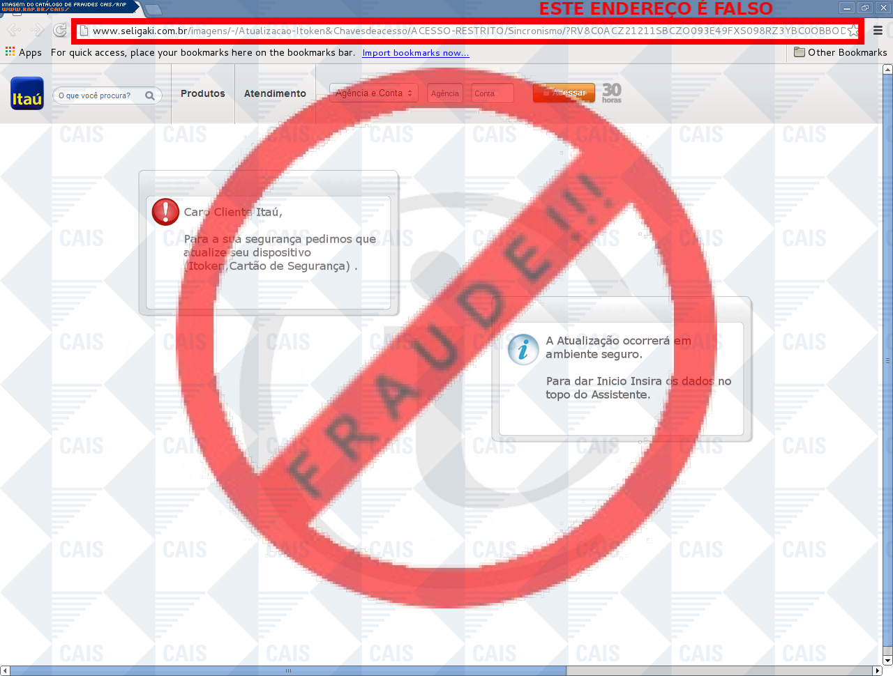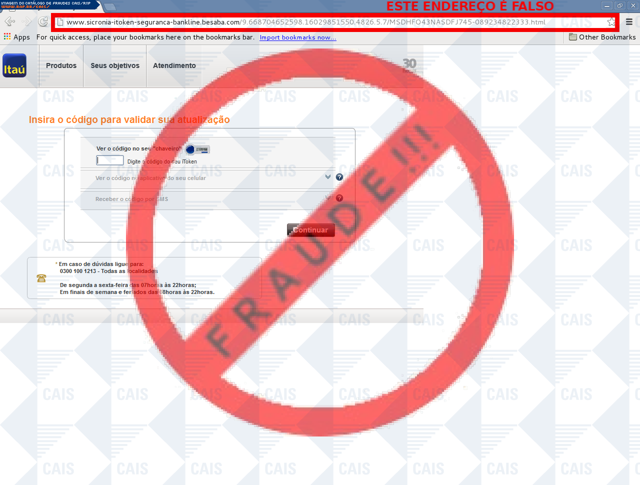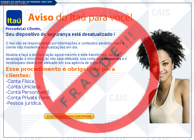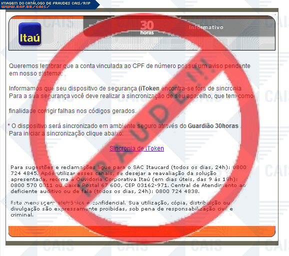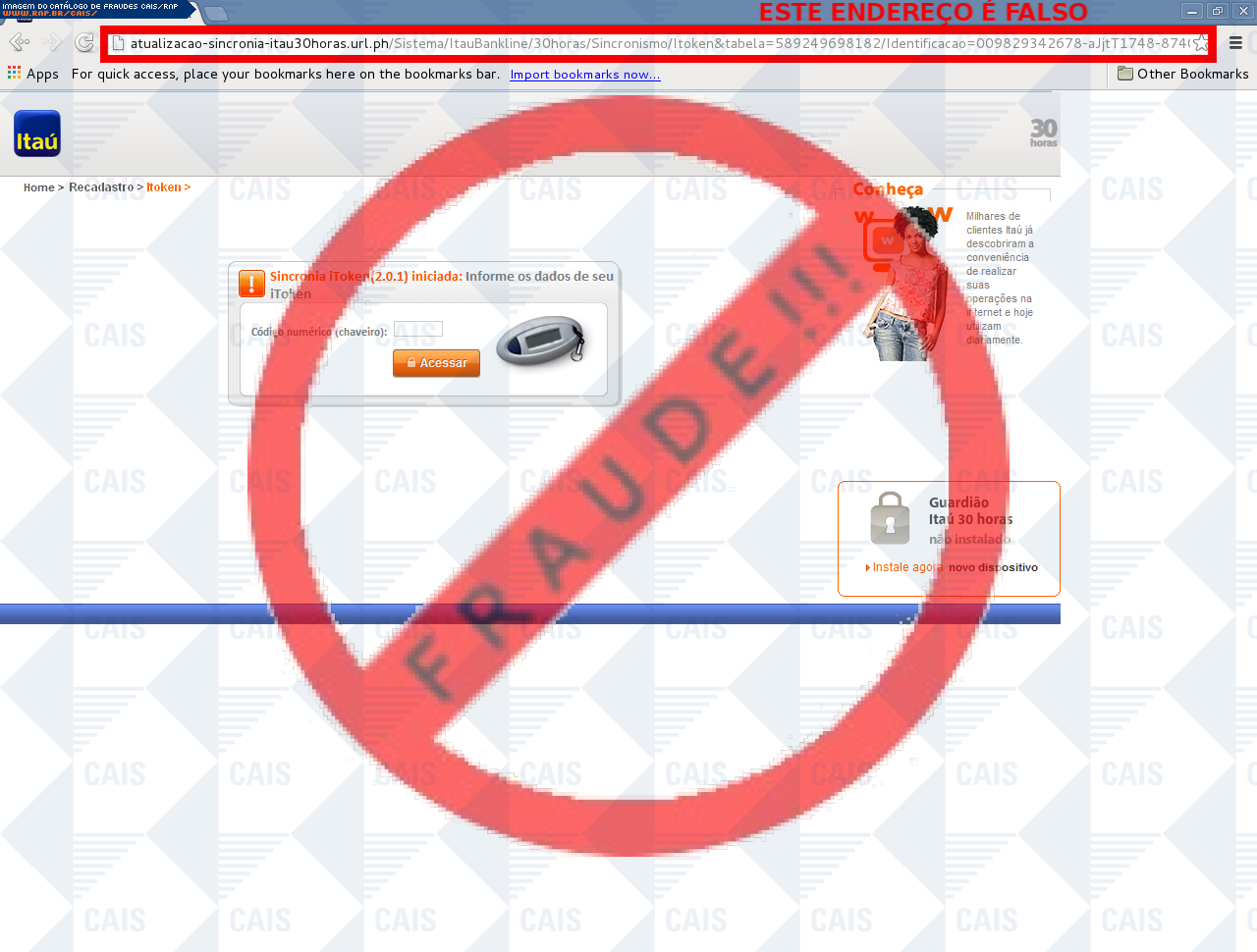 | comentário | O usuário recebe uma mensagem informando que seu dispositivo itoken está fora de sincronização sendo necessário uma atualização, no entanto a página originada é maliciosa criada para roubar os dados bancários das vítimas. | |