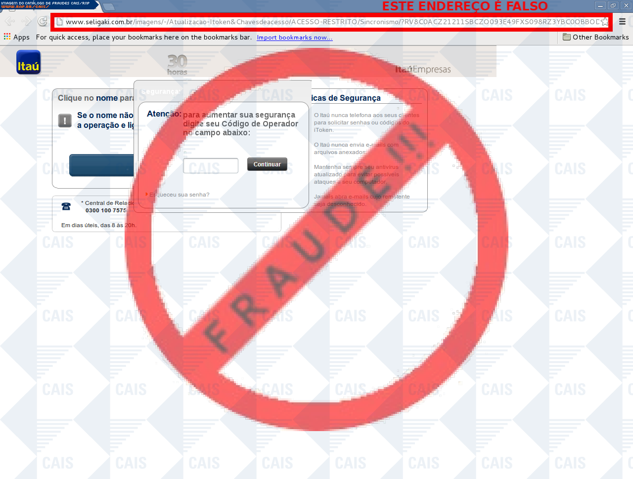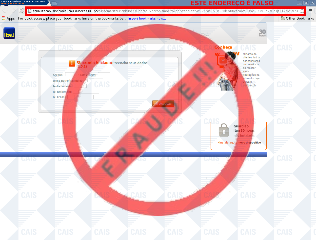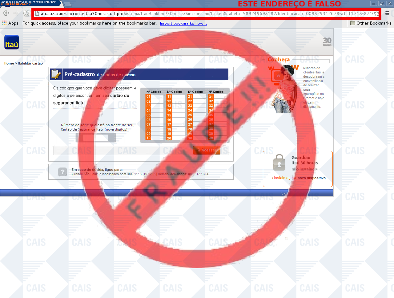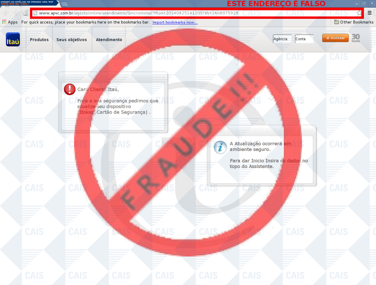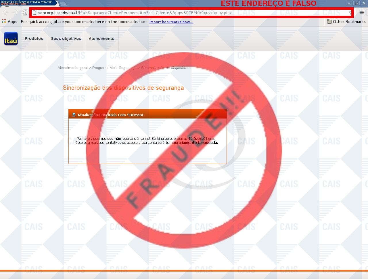 | comentário | O usuário recebe uma mensagem informando que seu dispositivo itoken está fora de sincronização sendo necessário uma atualização, no entanto a página originada é maliciosa criada para roubar os dados bancários das vítimas. | |