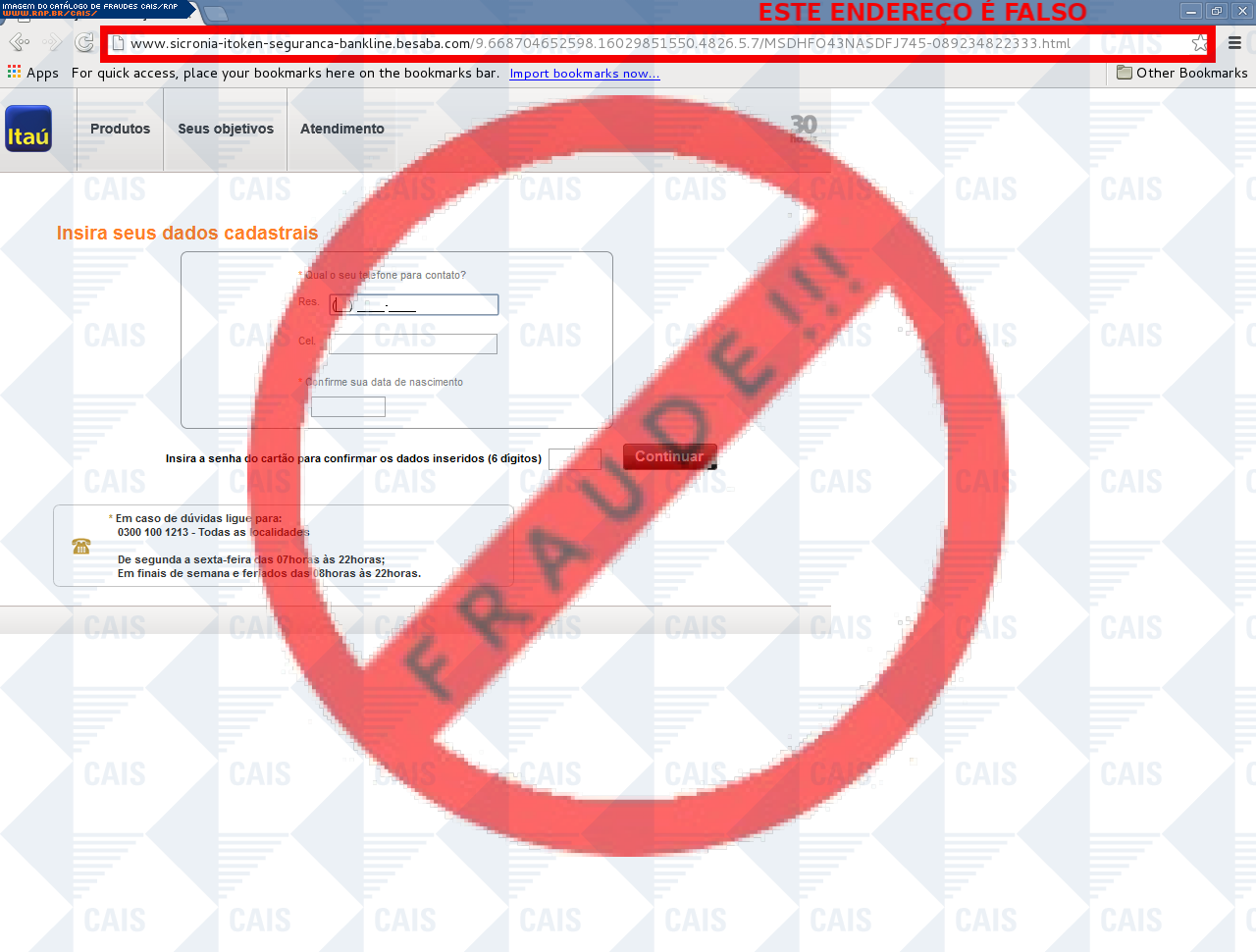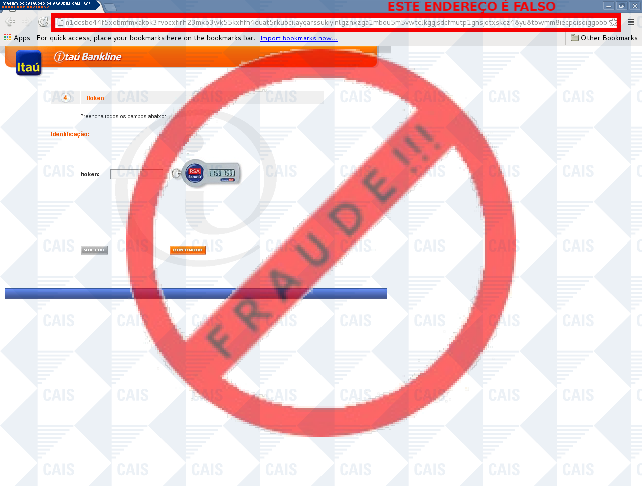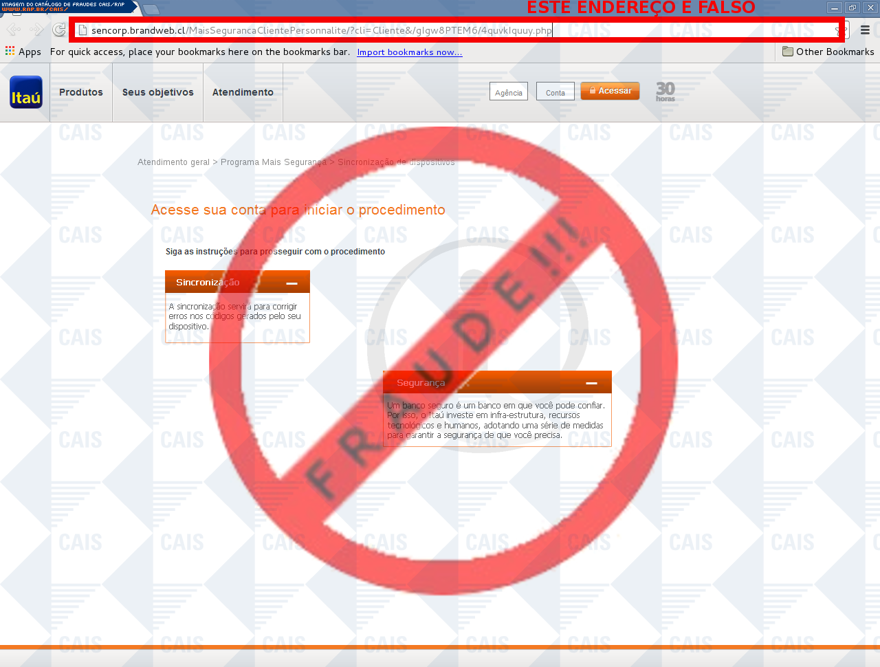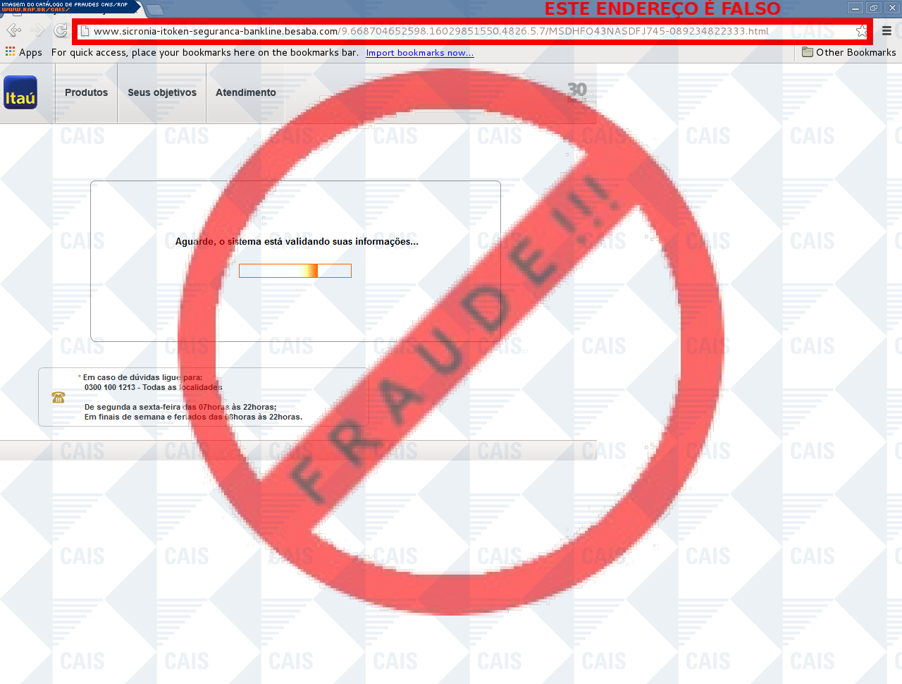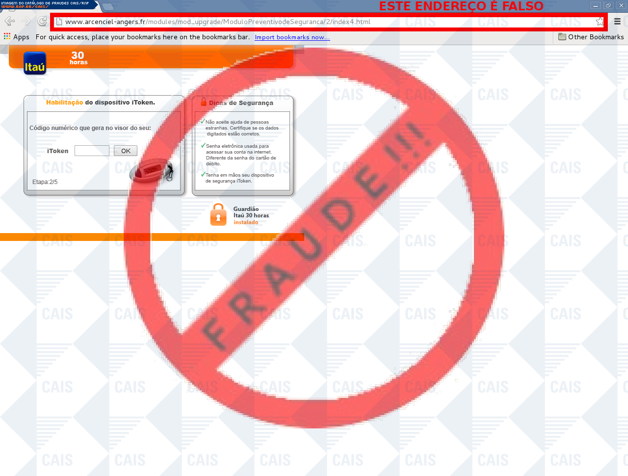 | comentário | O usuário recebe uma mensagem informando que seu dispositivo itoken está fora de sincronização sendo necessário uma atualização, no entanto a página originada é maliciosa criada para roubar os dados bancários das vítimas. | |