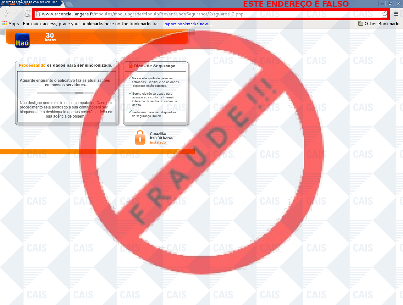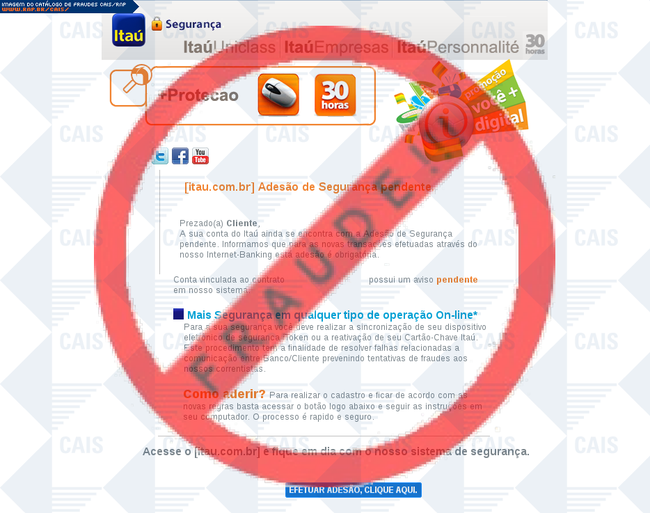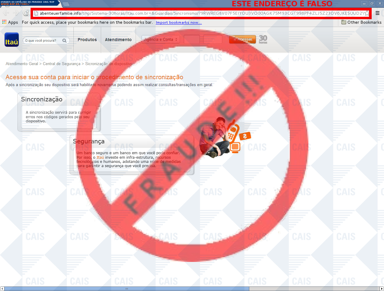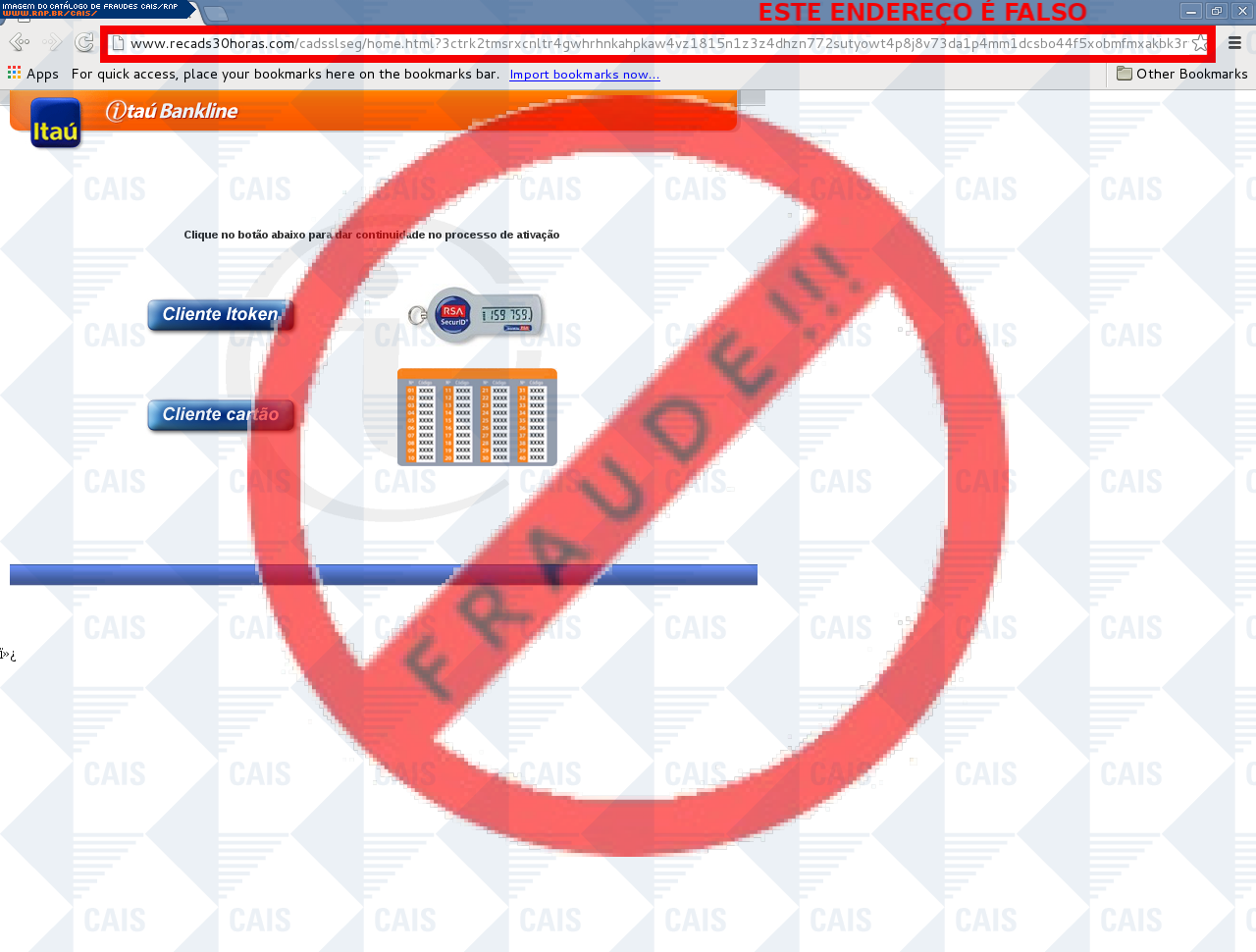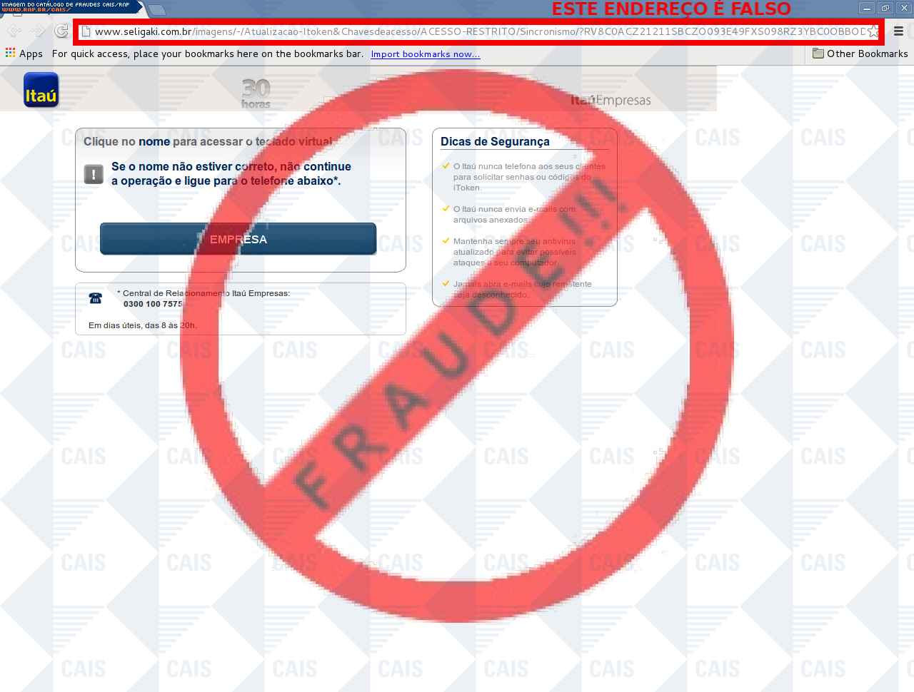 | comentário | O usuário recebe uma mensagem informando que seu dispositivo itoken está fora de sincronização sendo necessário uma atualização, no entanto a página originada é maliciosa criada para roubar os dados bancários das vítimas. | |