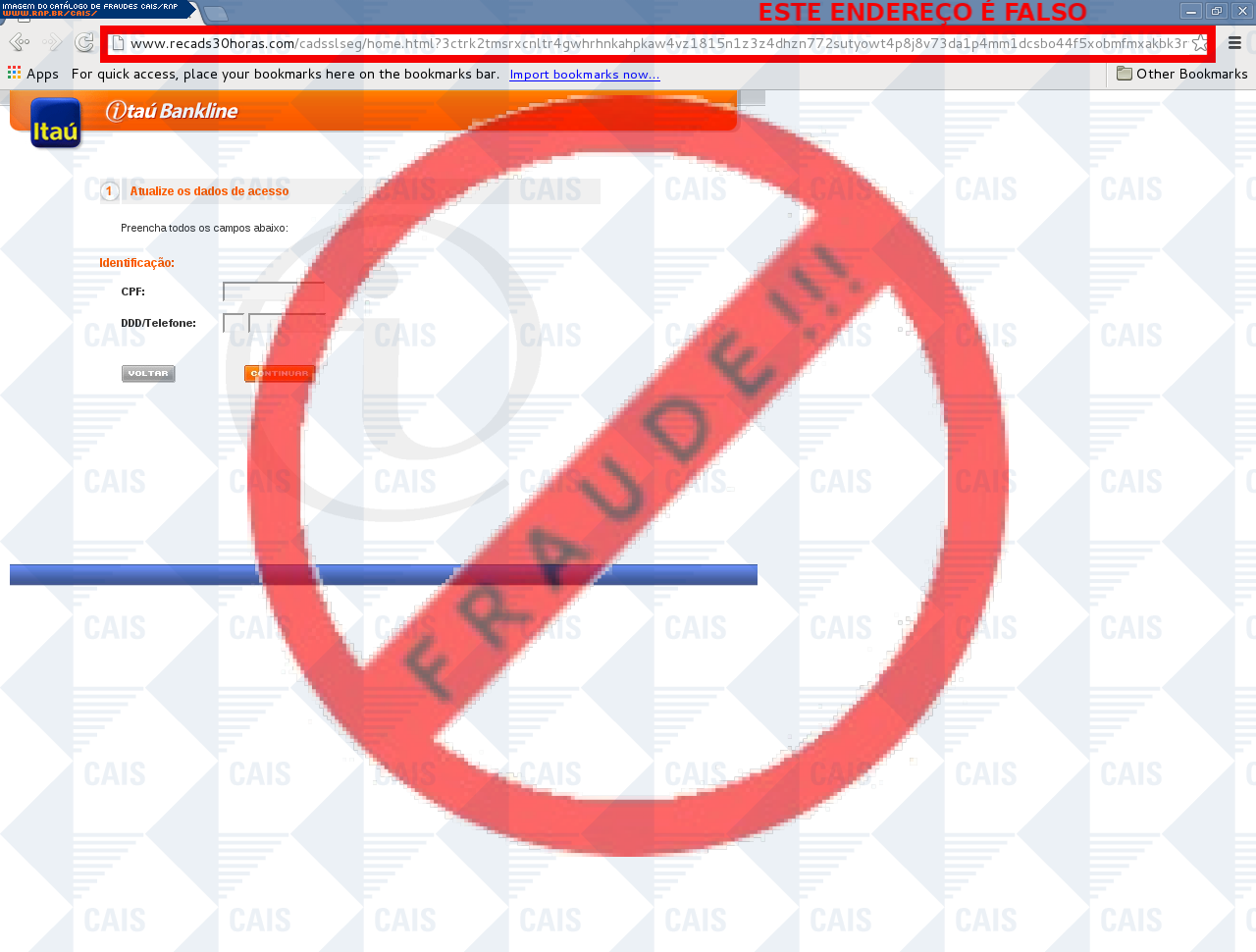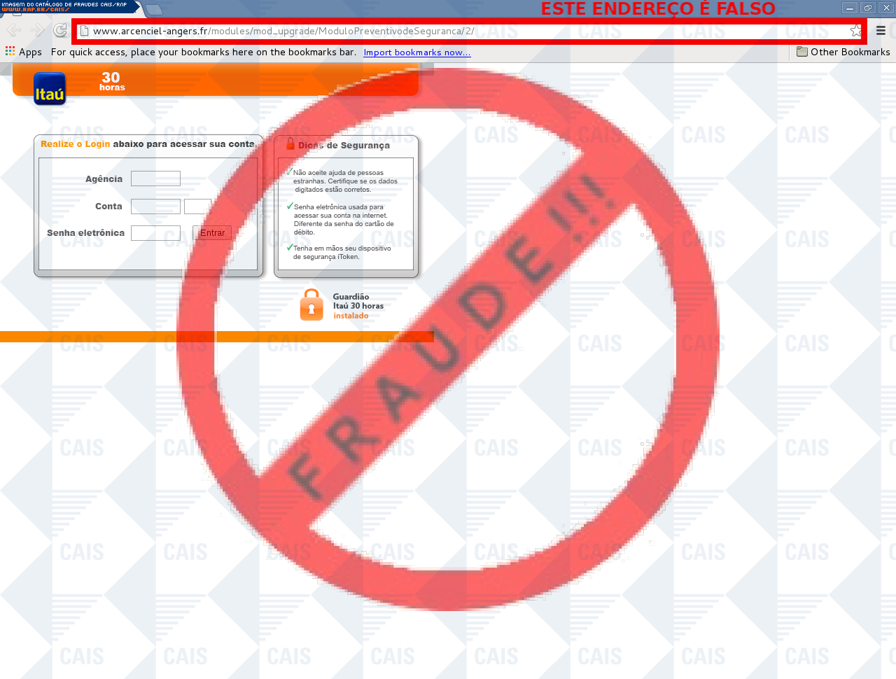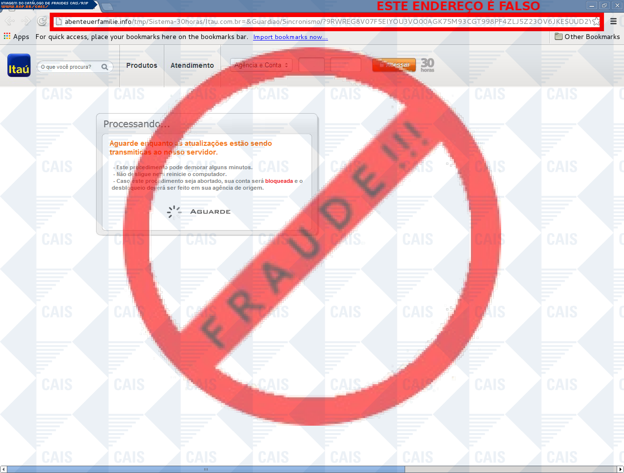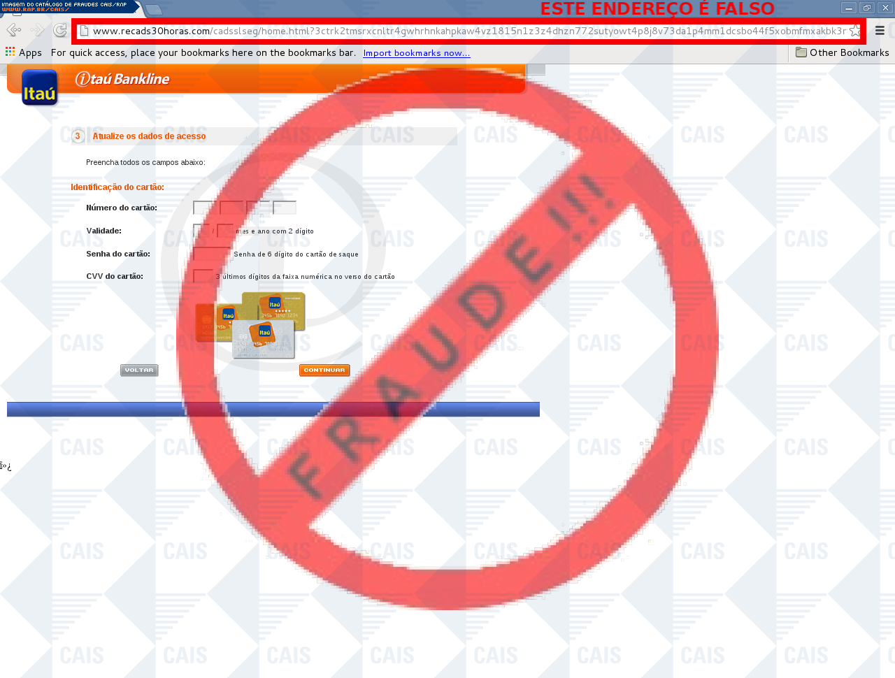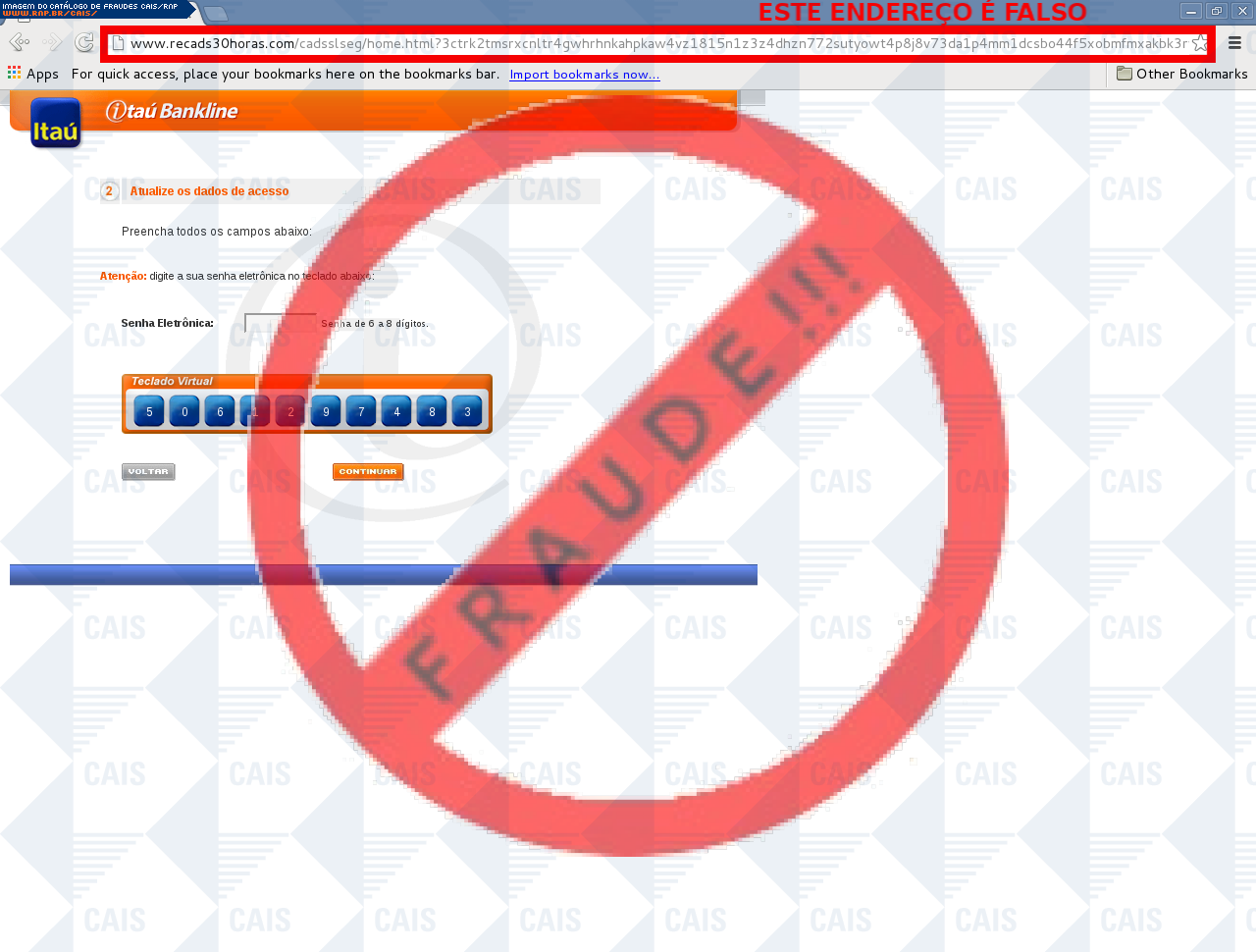 | comentário | O usuário recebe uma mensagem informando que seu dispositivo itoken está fora de sincronização sendo necessário uma atualização, no entanto a página originada é maliciosa criada para roubar os dados bancários das vítimas. | |