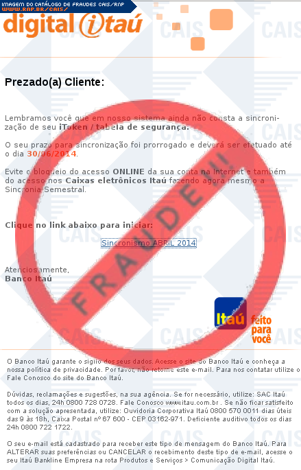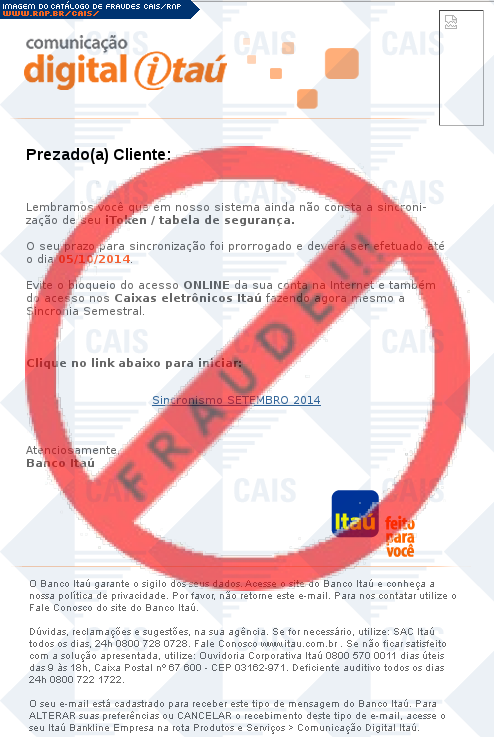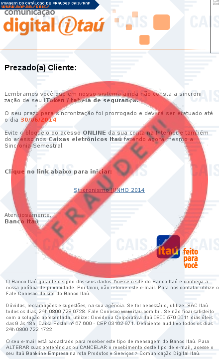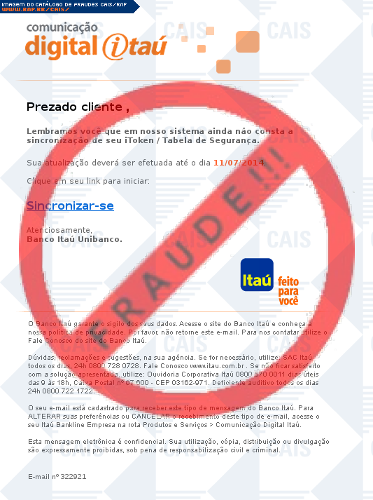 | comentário | O usuário recebe um e-mail informando que é necessário sincronizar o dispositivo de segurança da sua conta no banco Itaú no link disponibilizado, entretanto a página fornecida é falsa criada para roubar os dados bancários da vítima. | |